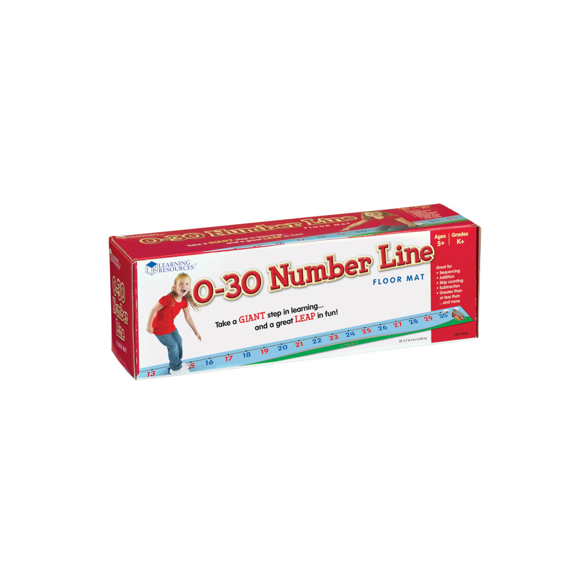 Reinforce number recognition, counting, addition and subtraction with kinesthetic movement. Mat features popular left-to-right visual representation and includes numerals from 0-30. Numerals are color coded (blue evens, red odds, and black zero). Includes: Floor Mat, Activity Guide. Mat measures 22'L x 1'W. Grades: Kindergarten +. Common Core State Standards Alignment: Counting & Cardinality, Operations & Algebraic Thinking. Learning Style: Kinesthetic, Visual. Skill Development: Math —Explore number order and identify multiples. Give students a task to hop or skip to multiples of 2, 3, 4, 5, etc. As the numbers become larger, their movements become greater and heighten kinesthetic learning. Math — Color-coded numbers on the Number Line Floor Mat help students easily identify even and odd numbers. This skill helps introduce basic principles of integers. Gross Motor —Use this mat as a warm up activity to math class to get students' bodies moving and wake up their minds for cognitive learning. Run from one, stretch to seven and tip-toe to twelve to support your students need to move!