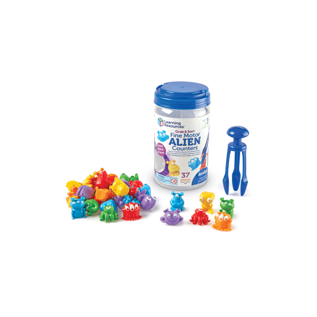 Blast off to new preschool skills with these out-of-this-world aliens! Kids strengthen math skills, pencil grip, and essential preschool fine motor skills every they sort with the Tri-Grip Tongs found with the Grab & Sort Fine Motor Aliens Counters from Learning Resources! Cast in 6 bright colors and 6 alien shapes, these preK manipulatives are ready for all kinds of early math activities—count them from 1-37, sort them by colors, match them by shape, and more! Parents and teachers can check out the included activity guide for fun toddler activities, or incorporate these preK manipulatives into existing lessons. In the midst of all this math fun, kids can also build essential preschool fine motor skills with the help of the set's Tri-Grip Tongs—specially designed to strengthen pencil grip, this fine motor tool builds essential skills with the help of its intuitive, kid-friendly design. After kids have grabbed, matched, and sorted the last alien of the day, the alien counters of this STEM toy for kids return to their reusable plastic storage bin, where they'll stay neatly stored until the next cosmic math adventure. For an even quirkier touch, leave the aliens out and add a touch of space décor to bedrooms and play rooms!
