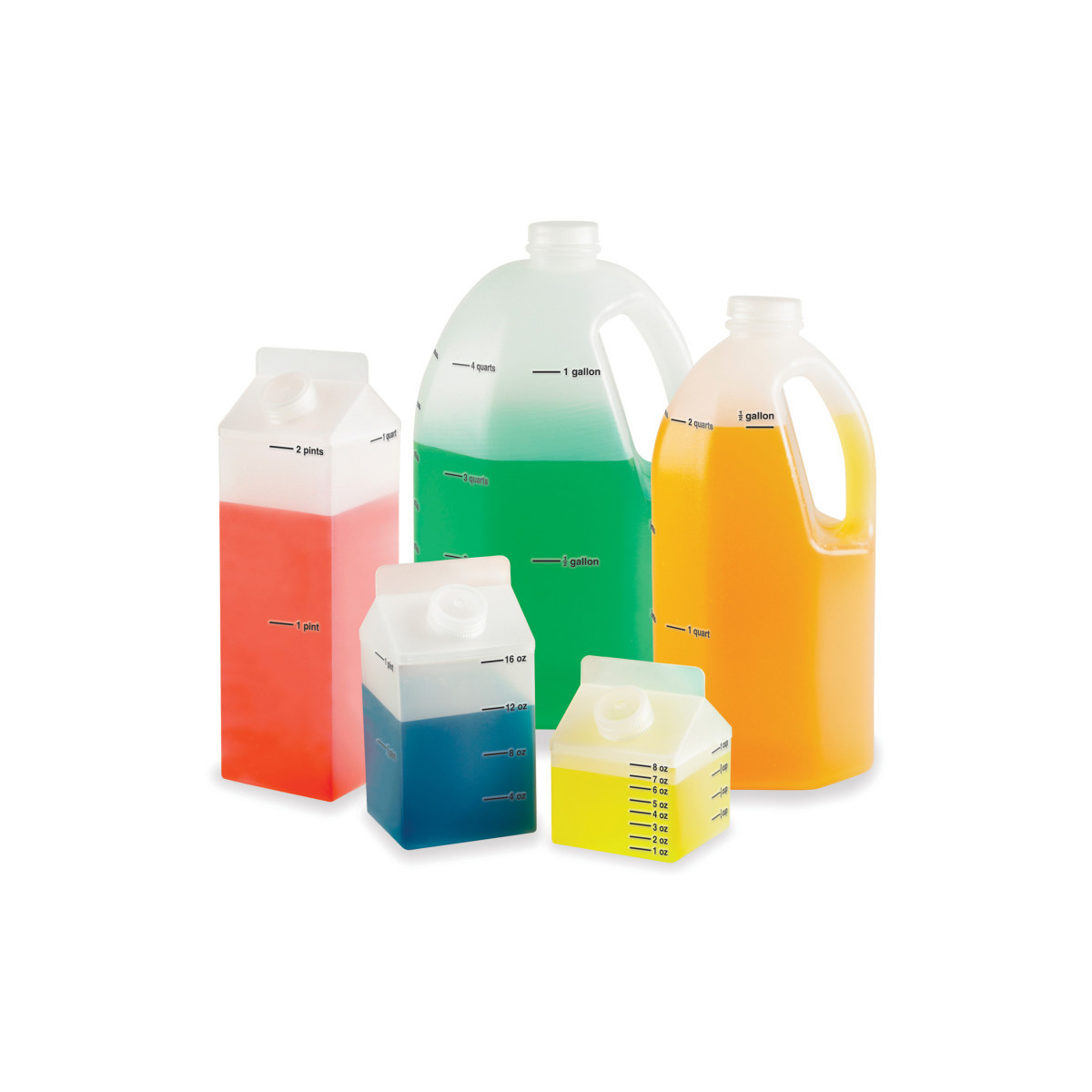 This 5-piece liquid measuring set is designed to resemble familiar household containers for easy recognition of common liquid capacities: a gallon, half-gallon, quart, pint and cup. Sturdy plastic set features clear markings of equivalencies. Great for life-skills activities, science experiments, classroom demonstration and individual exploration of liquid measurements and related topics. Guide with suggested activities and conversion tables included.