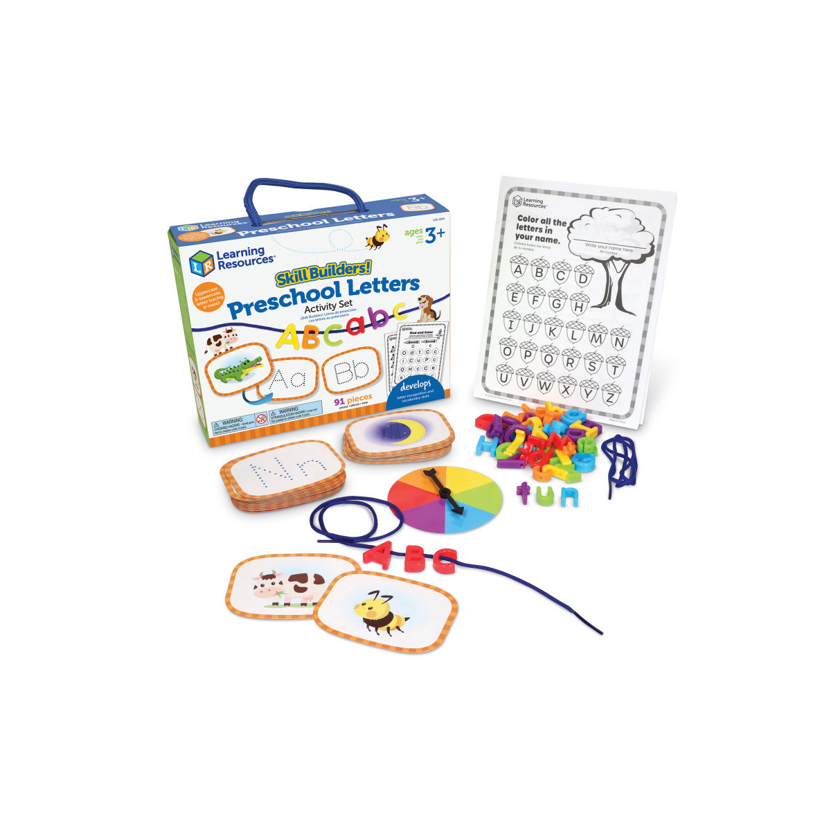 Play your way to preschool-ready spelling and language skills! Set your kids on the path to school success with the fun, quick letter activities found in the Skill Builders! Preschool Letters activity set from Learning Resources. This 91-piece set comes with all of the hands-on activities needed to help kids learn and retain essential language and letter skills; recognize uppercase and lowercase, learn alphabetical order, build short vocabulary words with 52 lacing letters, and more! Designed with all kinds of spelling, language, and letter skills in mind, Skill Builders! Preschool Letters is a versatile way to learn; whether you're looking for homeschool supplies or teacher supplies for classroom instruction, this set has the fun, active play you need! This set can even function as inspiration for self-correcting ESL exercises! Skill Builders! Preschool Letters also comes with a built-in carrying case, so you can build your early spelling and language skills on the go!