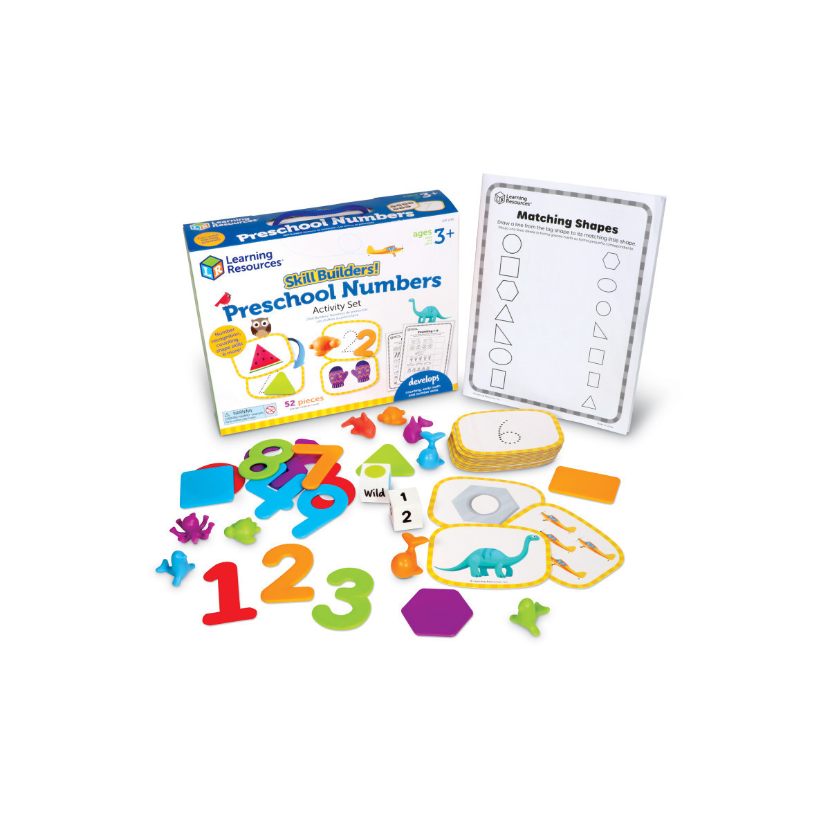 Play your way to preschool-ready early math skills! Set your kids on the path to school success with the fun, quick preschool activities found in the Skill Builders! Preschool Numbers activity set from Learning Resources. This 52-piece set comes with all of the hands-on preschool activities needed to help kids learn and retain early number skills; build hands-on number recognition with 10 included animal counters, visualize shapes for lessons in early geometry, boost number recognition through tracing activities, and more! Designed with all kinds of early math skills in mind, Skill Builders! Kindergarten Math is a versatile way to learn; whether you're looking for homeschool supplies or teacher supplies for classroom instruction, this set has the fun, active play you need! Skill Builders! Preschool Numbers also comes with a built-in carrying case, so you can build your early number skills with on-the-go preschool activities!