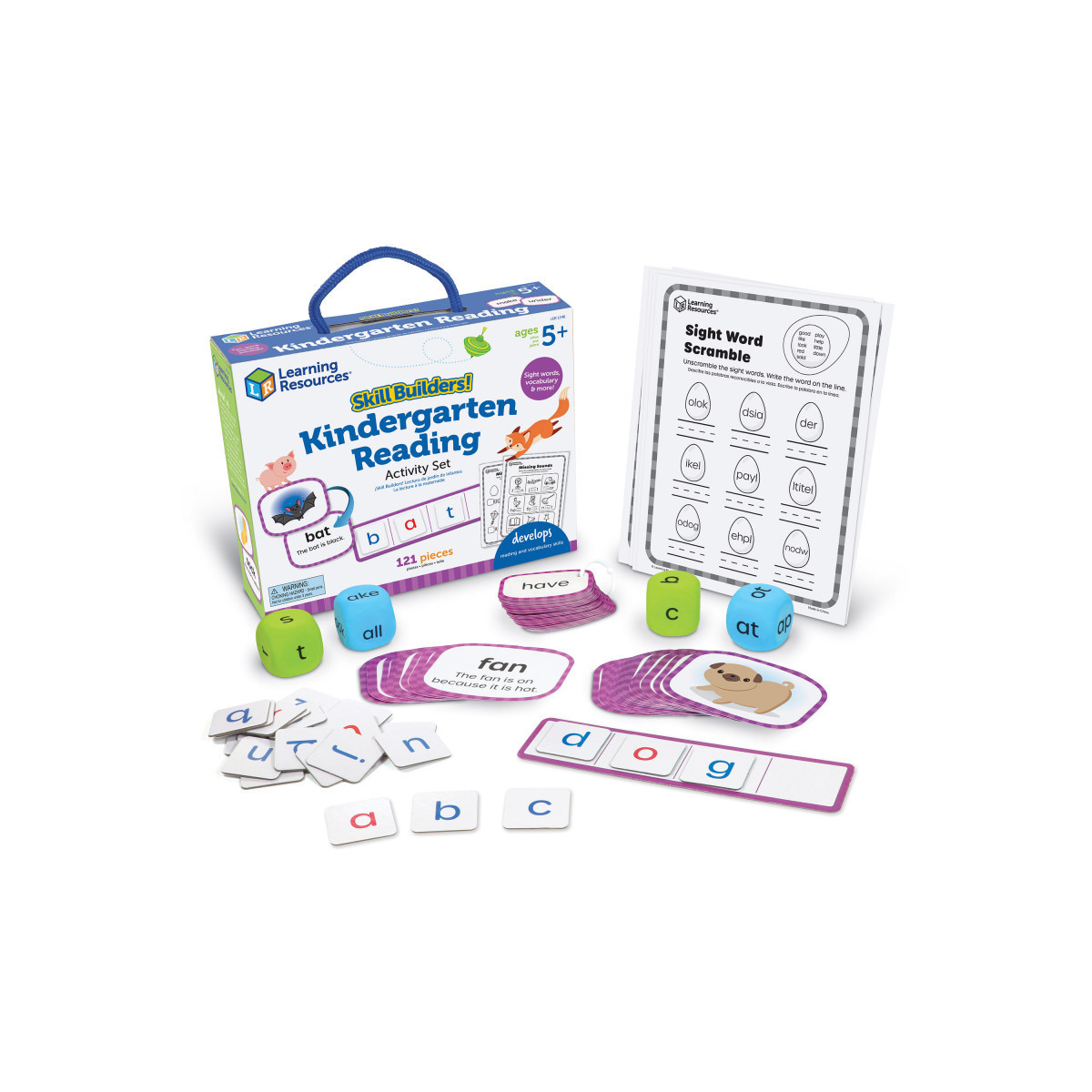 Play your way to kindergarten-ready spelling and language skills! Set your kids on the path to school success with the fun, quick reading activities found in the Skill Builders! Kindergarten Reading activity set from Learning Resources. This 122-piece set comes with all of the hands-on activities needed to help kids learn and retain essential language and writing skills; visualize sight words with 50 flashcards, strengthen spelling skills with 26 letter tiles, match words with images during vocabulary activities, and more! Designed with all kinds of spelling, language, and reading skills in mind, Skill Builders! Kindergarten Reading is a versatile way to learn; whether you're looking for homeschool supplies or teacher supplies for classroom instruction, this set has the fun, active play you need! This set can even function as inspiration for self-correcting ESL exercises! Skill Builders! Kindergarten Reading also comes with a built-in carrying case, so you can build your early spelling and language skills on the go!