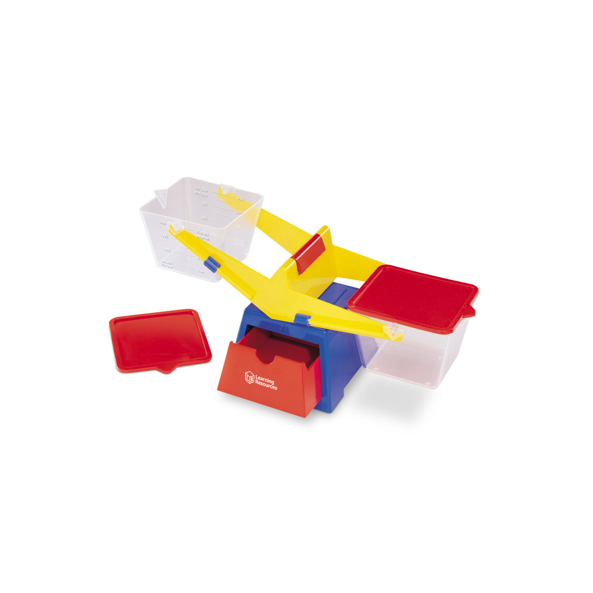 Measure, explore volume and make comparisons of solids and liquids with this sturdy bucket balance with lids. Removable calibrated clear buckets hold solids or up to 400 ml of liquid. Easy pour spout makes measuring liquids easy. Lids can be used as platforms and the built-in drawer is perfect for storing weights. Balance measures: 16.5" x 6.5" x 6".