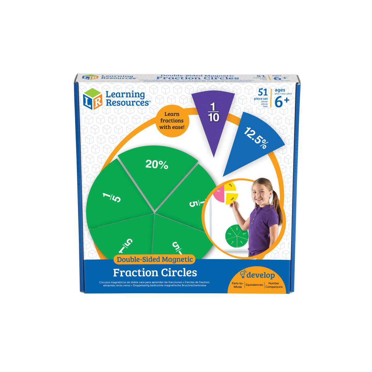 Demonstrate fractions, percentages and equivalencies on your whiteboard. Helps students understand relationships between concepts of fractions and percentages -- labeled with fractions on one side and percentages on reverse. Extends learning through color-coded coordination to Rainbow Fraction resources. Supports key NTCM Standards. Includes 9 circles, each measuring 7.5'', includes whole, 1/4, 1/2, 1/3, 1/4, 1/5, 1/6, 1/8, 1/10 and 1/12. Includes Activity Guide. Grades 1+.
