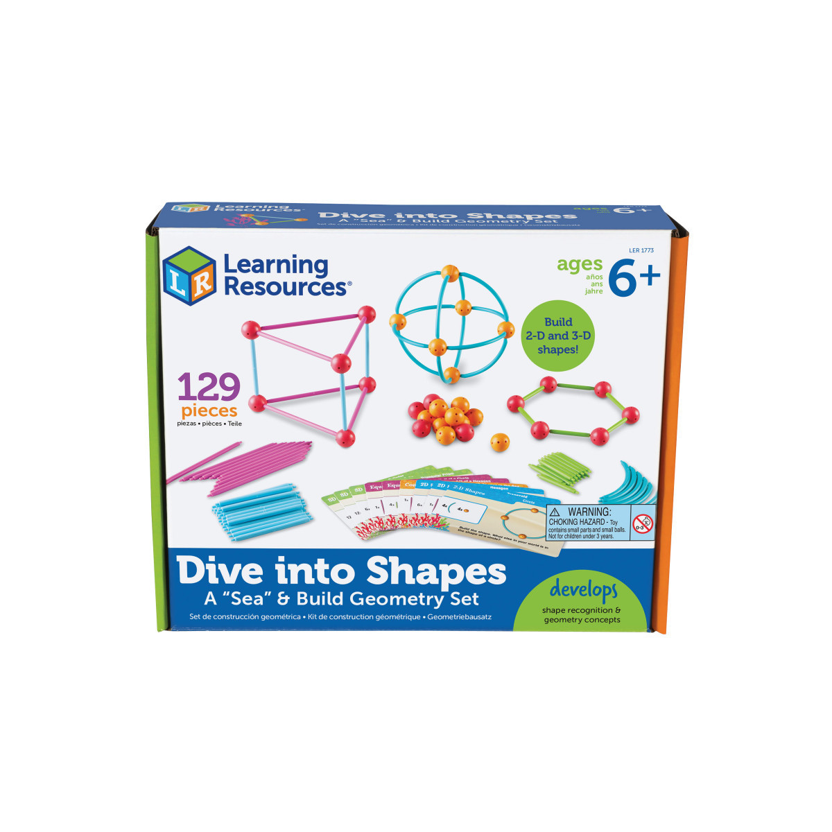 Splash into geometry! Combine sticks in 3 sizes, along with curves for making circles and cylinders, with 2 different types of connectors to build 2-D shapes. Then, combine them to make new 2-D shapes or even 3-D shapes! Child-friendly set features durable sticks, curves, and connectors. Includes 60 sticks in 3 sizes (2.25", 3.5", 5.25"), 20 curves, 34 connectors (approximately 1" in diameter), and 15 double-sided activity cards (30 activities). Age 6+/Grade 1+.