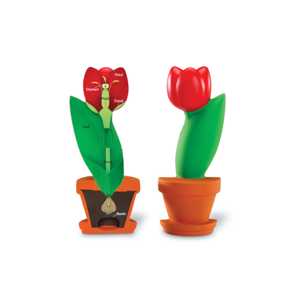Demonstrate the parts of a flower in plant science lessons with this durable foam tulip model. One half of cross-section is labeled with part names (stamen, petal, pistil, sepal, stem, leaf and roots); other half is labeled with letters for assessment activities. For more detailed study, Activity Guide features discussion and labeled drawing of additional flower parts, including filament, anthers, stigma, style and ovary. Foam model wipes clean and measures approximately 6"H.
