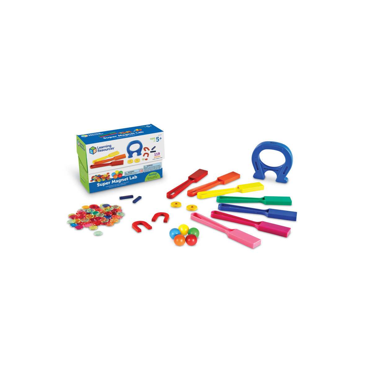 Get magnetized! Everyone can explore with this complete 119-piece magnetic classroom set for 25 students. Kit includes: 100 magnetic chips, 5 large magnetic marbles, 7 magnetic wands, 2 metal bar magnets, 2 metal ring magnets, 2 mini metal horseshoe magnets, 1 plastic horseshoe magnet (5"), storage box, and Teacher's Guide. Large horseshoe magnet measures 4.75"L x 4.5"W. Wands measure 7.75"L