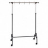 This versatile steel chart stand adjusts to hold both pocket and flip charts. Features sturdy locking casters and 5-ring style hooks for hanging. The height adjusts from 50" to 80" and the length from 35" to 74" for maximum display space. Easy to assemble.