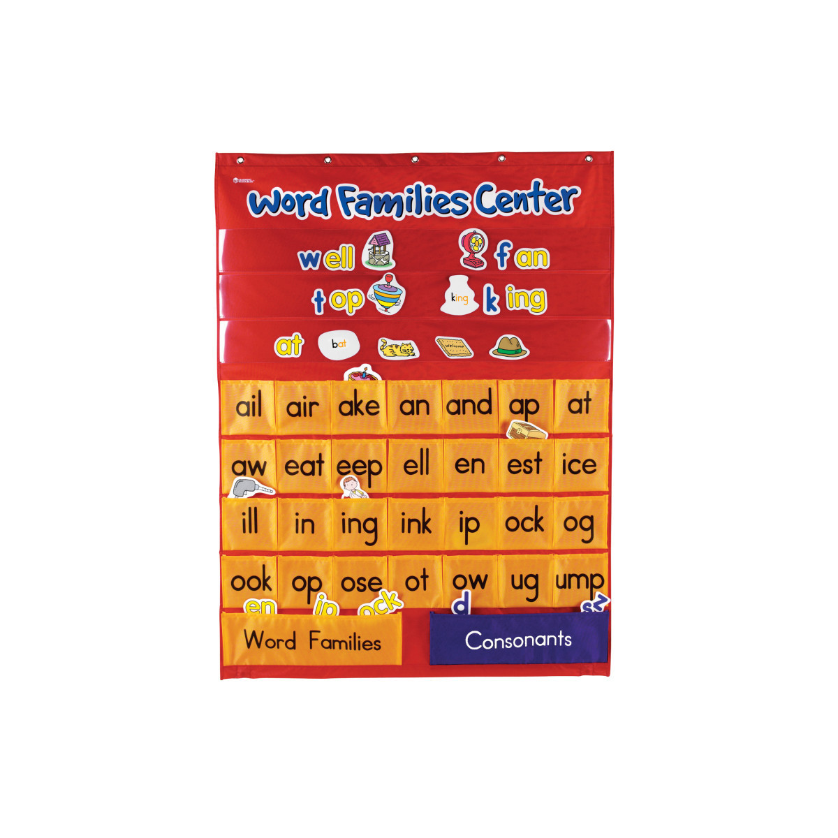 Bright colors and fun images are a great way to teach word families and rhyming. Kids match picture cards with letter cards and do word sorts based on common word families. Heavy-duty pocket chart features three clear pocket rows for card display and 214 coated cards, including die-cut picture cards, word family cards, consonant cards and blank cards. Teacher's Guide included.