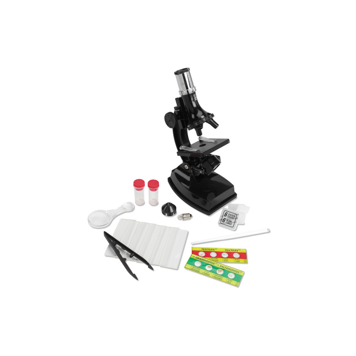 For beginning scientists. Magnifies up to 600x. Mirror, light, vials, tweezers, slides and hand magnifier included. Grades 2—8. Requires two AA batteries, not included.