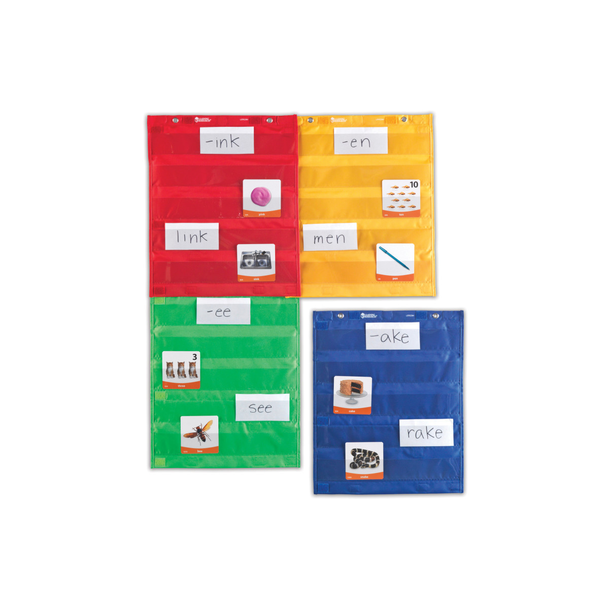 Magnetic Pocket Chart Squares Beyond versatile! Use the 4 charts alone, connect vertically or horizontally with hook-and-loop fasteners to make a larger chart! Great for small groups, centers, combined whole-group displays and more. Features 5 rows of clear pockets for your own cards, plus 2 large storage pockets on the reverse side. Four colors- red, orange, blue, green. Hang with included magnets or grommets. Each chart measures 14"L x 17"H.