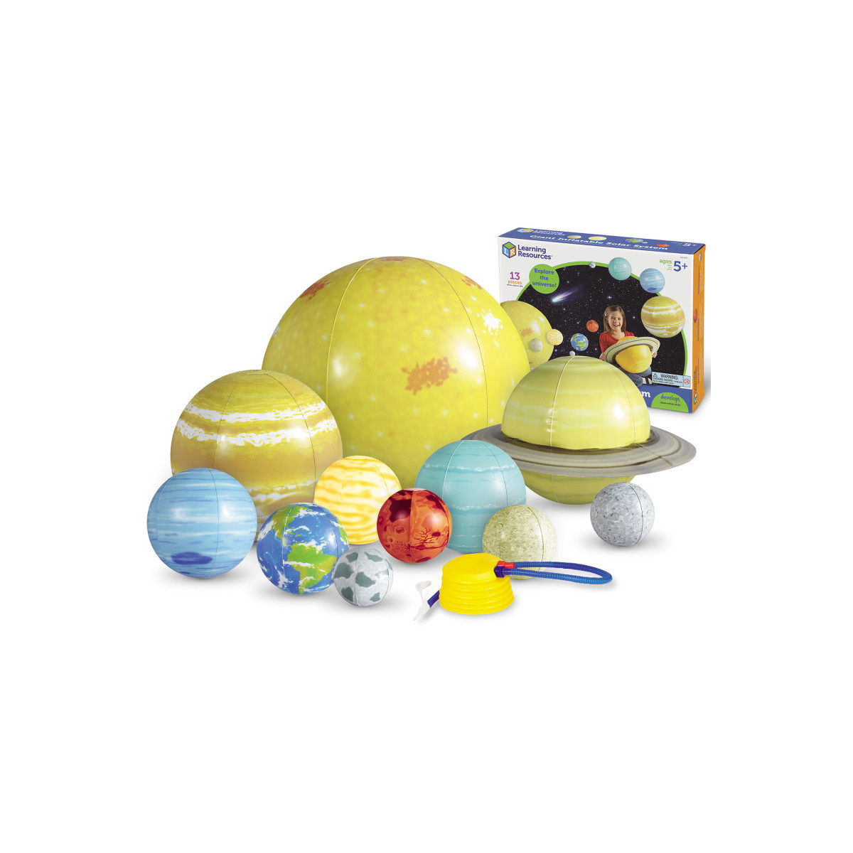 Demonstrate rotation, revolution, and orbit in 3 dimensions with this durable, washable solar system set. Teach the position, order, size, and shape of the planets and sun. Also great for creating an out-of-this-world playroom or bedroom. Each colorful planet (and sun) inflates easily. Loops included for easy hanging. This unique solar system set turns any room into an intergalactic experience. Includes: 8 planets with hanging hooks, Pluto, Sun, Earth's Moon, convenient foot pump, activity guide with fun planet facts, and a repair kit. Sun measures 23" in diameter, Jupiter measures 14" in diameter, Saturn measures 11.5" in diameter and includes attached rings, Neptune measures 9" in diameter, Uranus measures 9" in diameter, Venus measures 7.5" in diameter, Earth measures 7.5" in diameter, Mars measures 6" in diameter, Mercury measures 6" in diameter, Pluto measures 5" in diameter, and Earth's moon measures 5" in diameter. Grades K+.
