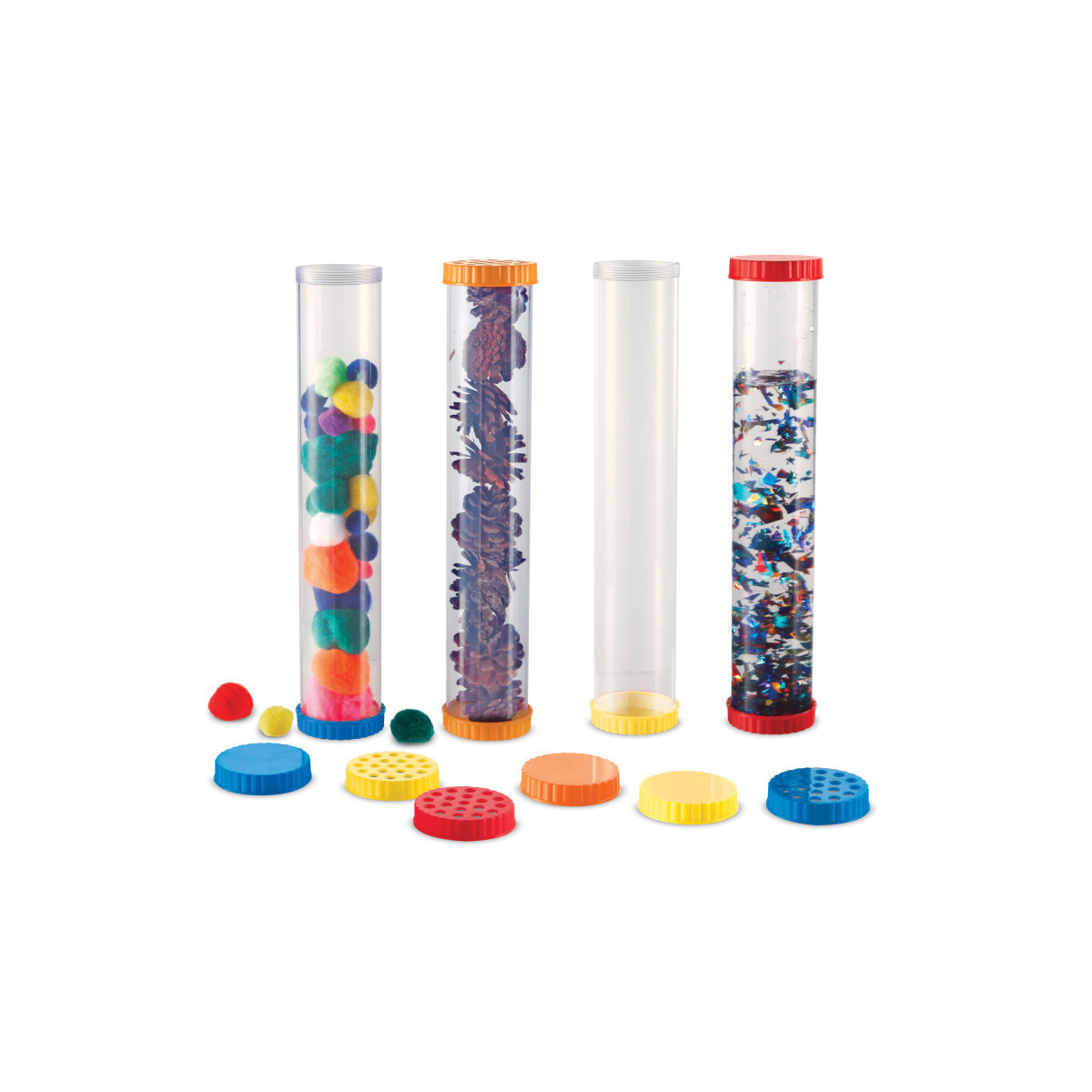 Develop their senses and encourage science exploration with this set of 4 sturdy, clear tubes. Tubes feature dual openings and 2 solid lids for each. Four vented lids let children explore their sense of smell or secure small creatures for observation.