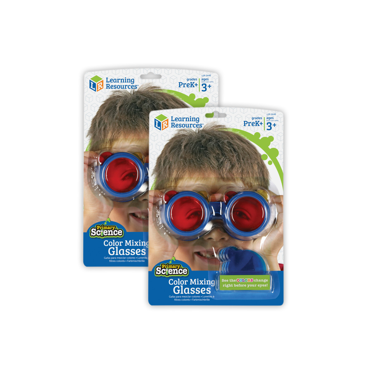 Take a look! These unique child-size glasses and interchangeable lenses let students observe the world while learning about color. Each pair of glasses feature 8 easy-to-change lenses-2 each of red, yellow and blue and distortion lenses that let you see the world like a bug. Teaches primary colors as well as mixing to make secondary colors by combining up to 2 lenses per side. Allows additional instruction and kaleidoscopic fun when you use the lenses on their own. Includes color-mixing chart. Durable plastic glasses are sized just right for children, and wipe clean with a damp cloth. Sold as a pack of 2 Color Mixing Glasses.