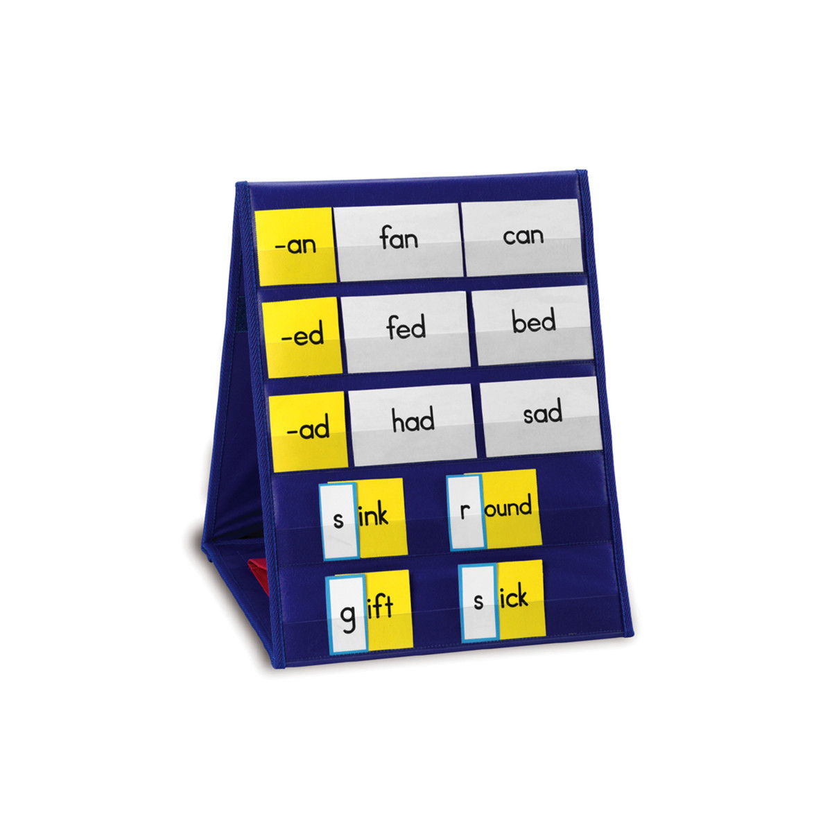 No stand needed with this convenient pocket chart. Just set it up on the table for small group or individual use. Includes 10 clear sentence strip pockets for activity cards (sold separately) and large window pocket to hold manipulatives. Measures 16" x 16" x 10," has a sturdy handle and collapses for storage. Activity guide included.