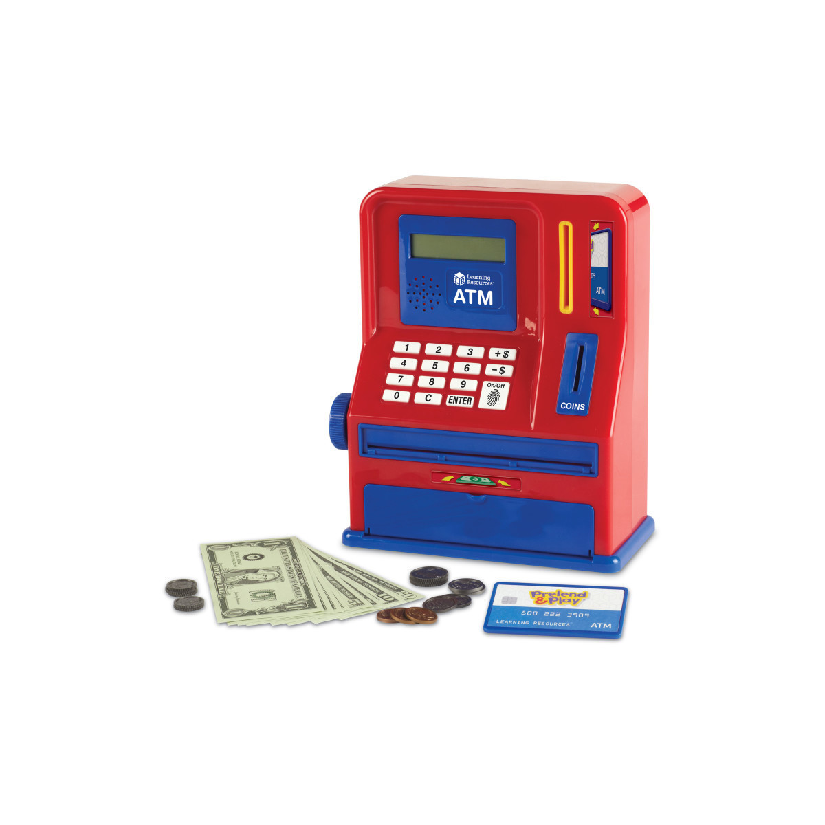 Children will learn money skills while they withdraw, deposit, and save money with this electronic ATM bank. Use with the included play money or your own real money. Bank will recognize play and real coins. Also has a mechanical bill feeder. ATM measures 8"W x 10"H.