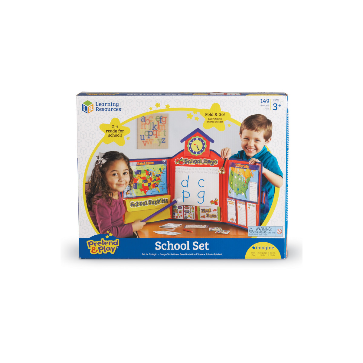 Ring the bell, it's time for school!! Help your child get excited about school by encouraging him or her to play the teacher! This inviting role-play set includes 149 must-have supplies - enough to teach, learn and have fun! Children ages 3 and up can set up their own classroom, 'teach' their friends or siblings and earn an A+ in imaginative play. The included teacher supplies help them 'teach' most of the subjects taught at school. There is even a clock on the top with moveable hands to keep track of class time and a working bell for an authentic school day experience. Encourages school readiness and conversations about going to school that help reduce first-day jitters. Tri-fold board, Grade book, Stickers, Hall passes, Dry erase board, Hand pointer, Crayons, Double sided calendar, and Double sided map. Tri-fold board measures 38"L x 16"H. Age 3+/Grades PreK+.