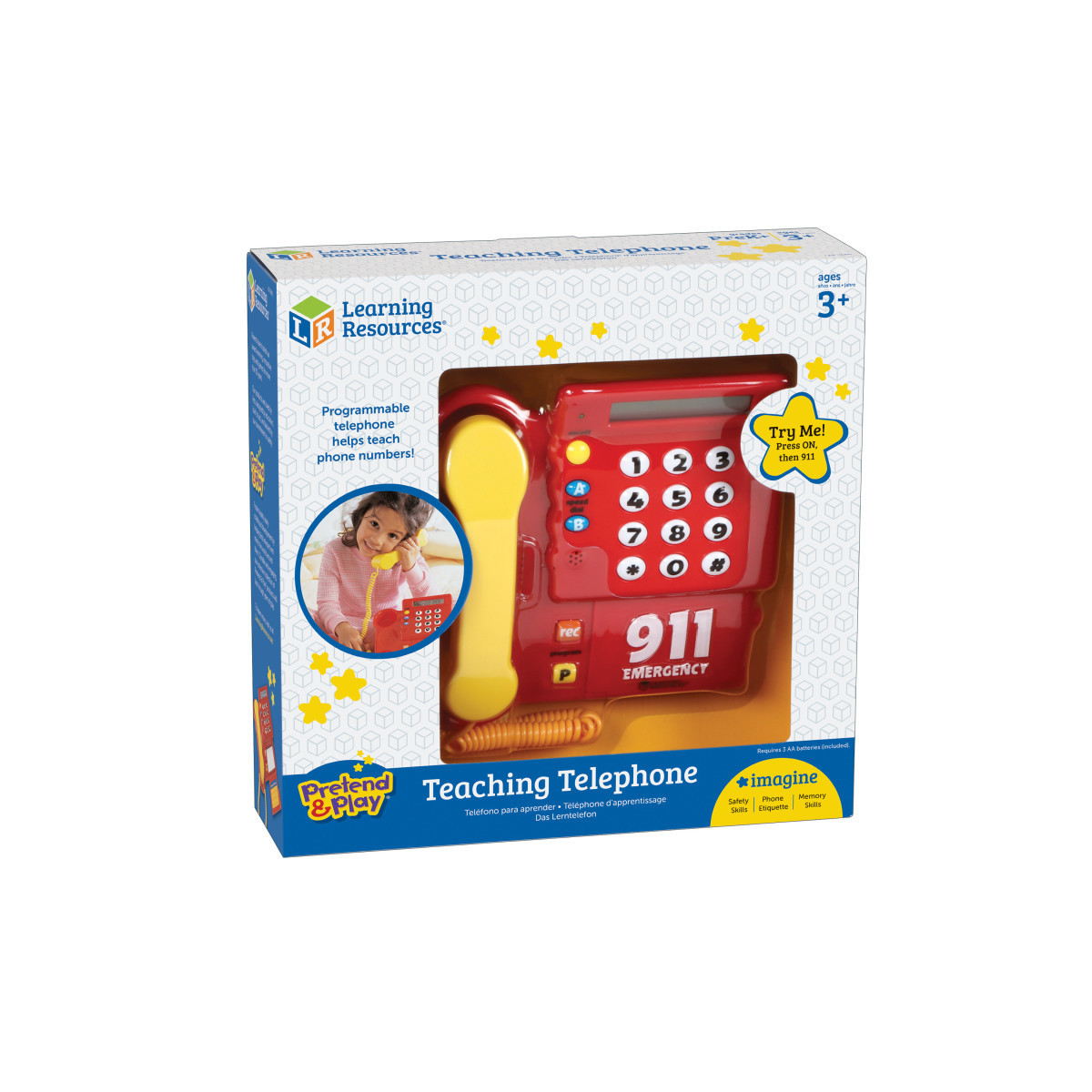 Easy-to-program telephone helps children learn how to call home, the 911 Emergency Service, and other important telephone numbers. Program in any number and record a message. When children dial the number correctly, they are rewarded by hearing your personal message. Program and record new messages again and again! Features realistic ring and big buttons for little hands. Requires 3 AA batteries, included. Grades: PreK+. Learning Style: Auditory, Tactile. Skill Development: Self Help - Operating a phone is a practical skill that students will use their entire lives. This pretend phone helps teach real skills in a controlled, relaxed manner. Social/Behavioral - Telephone practice and preparedness help boost students' confidence in independence, safety, and Iife skills. Language - Helps students practice what to say and do in an emergency. Students learn how to answer questions like, "Where do you live?," "What is the emergency?," and "What is your name?"