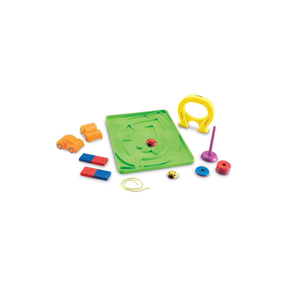 Attract early learners to the wonders of magnetism! STEM lessons are irresistible when you add the excitement of fun, colorful tools to scientific exploration. Durable, playful magnets in a variety of shapes engage children as they explore magnetism, polarity, and magnetic attraction & repulsion. Includes 2 bar magnets, 2 magnetic bugs, 4 ring magnets, horseshoe magnet, magnetic post, 2 snap-on cars, tray with maze, string, and 10 double-sided Activity Cards. Comprehensive Activity Guide with reproducible materials is also included. Largest piece (maze tray) measures 11"L x 8½"H x ½"W.