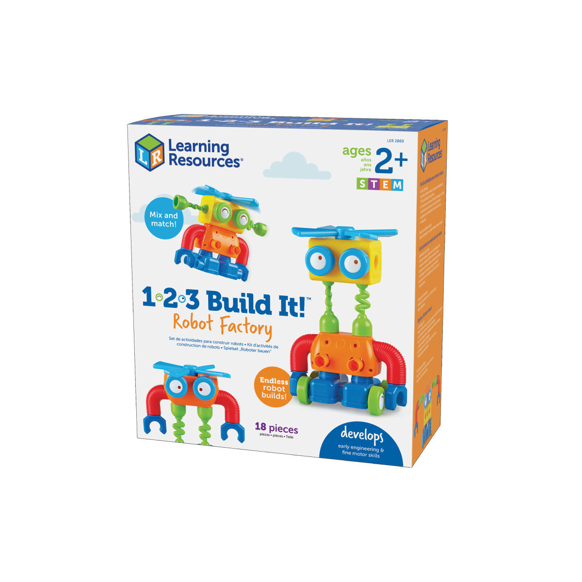What kind of robots can you dream up? Kids build their own twisting, turning STEM creations with the mix-and-match pieces of the 1-2-3 Build It! Robot Factory from Learning Resources. Sized just right for little hands, this build-it-yourself toy's chunky plastic pieces are ready to help kids design, build, and tinker with their own robo squad during open-ended play sessions. Build tall bots with squiggly green legs, add a few eyes to help your creation see, or snap on a propeller that really spins! 1-2-3 Build It! Robot Factory also comes with an Activity Guide featuring recommended builds, which helps kids learn essential STEM skills ranging from critical thinking and early engineering to following directions! The pieces in the 1-2-3 Build It! Robot Factory set work with all 1-2-3 Build It! building sets, so kids can make their creations even crazier!