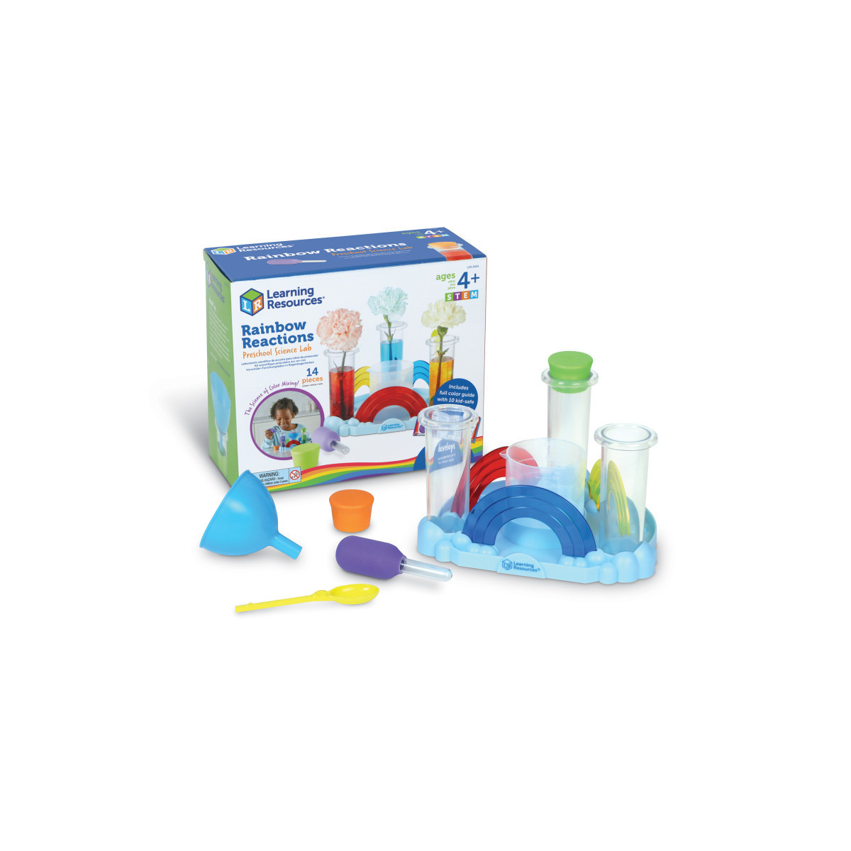 Mix up all the colors of the rainbow! Budding scientists discover the colorful side of science with the color-mixing experiments for kids in the Rainbow Reactions Preschool Science Lab from Learning Resources! Specially designed with young scientists in mind, this preschool science lab includes the kid-sized tools and easy-to-grasp activities needed to help kids build observation and experimentation skills. Follow along with the full-color guide’s 10 science experiments for kids (which turn common household ingredients into lessons on light and color) and use the color lenses, test tube, beaker, funnel, and dropper to build new fine motor skills along the way! When the colorful experiments are done for the day, this science kit’s pieces fit inside the Rainbow Reactions Preschool Science Lab for easy storage until the lab opens again. Lab measures 10"W x 8.5"H x 4.5"D. Experiment at home, or add to collections of STEM toys for classrooms! When kids observe and experiment with science kits from Learning Resources, they turn their kitchen tables into working science labs. Featuring science experiments for kids and tools inspired by real-world labs, these award-winning educational toys unlock the essentials of biology, chemistry, and physics through hands-on, screen-free play. Made from durable, BPA-free plastic, our science toys are ready for years of learning fun at home or in the classroom.