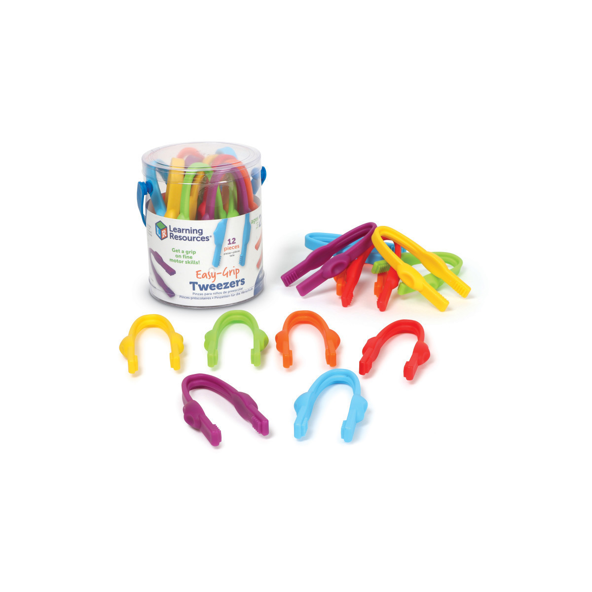 Get a grip on fine motor skills! Students strengthen hand muscles, pincer skills, coordination, and more when they grip and grab with the Easy-Grip Tweezers, one of the preschool learning toys from Learning Resources. Designed specifically with little hands in mind, these colorful chunky preschool learning toys come with finger placement grooves that ensure a comfortable grip and help kids get the hang of their new fine motor skills. These toddler toys are ready for all kinds of preschool learning activities—pair them with counters and manipulatives for a skill-building boost to counting and sorting lessons, or add them to classroom supplies and sensory bins for a sensory-friendly way to play, learn, and grow. This set of preschool learning toys includes 12 tweezers in six bright colors, so you'll always have enough for small-group activities. When the learning fun is done for the day, you can return these teacher must-haves to their reusable plastic storage bucket until it's time to play again!