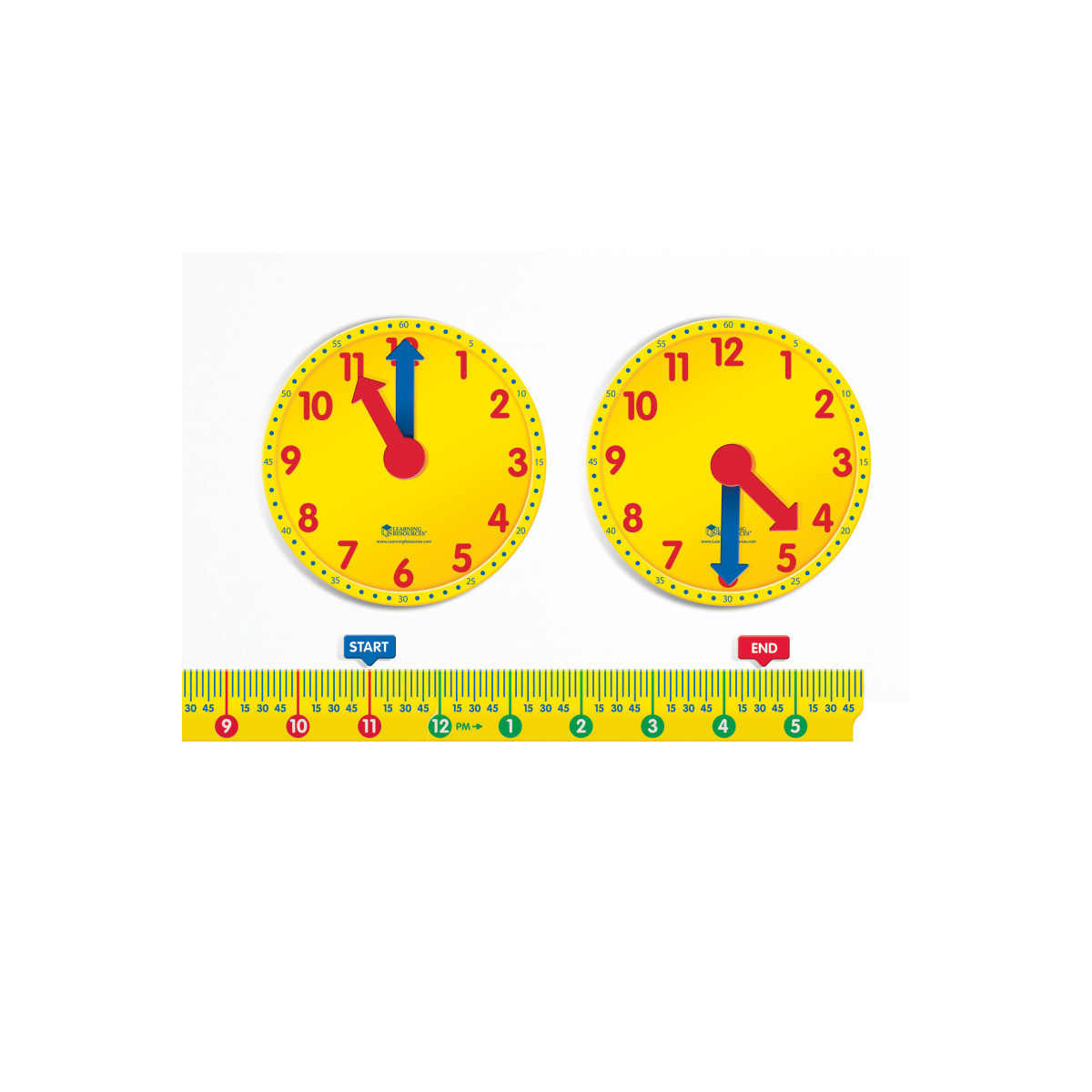 Demonstrate one of the toughest math concepts! Segmented timeline helps students understand that elapsed time can begin in the PM and end in the AM. Removable guide numbers support differentiation. Includes 2 magnetic clocks with hands, 24-hour timeline (4 segments), start and end time arrows, and removable guide numbers. Clocks measure 10". Grade 2+.