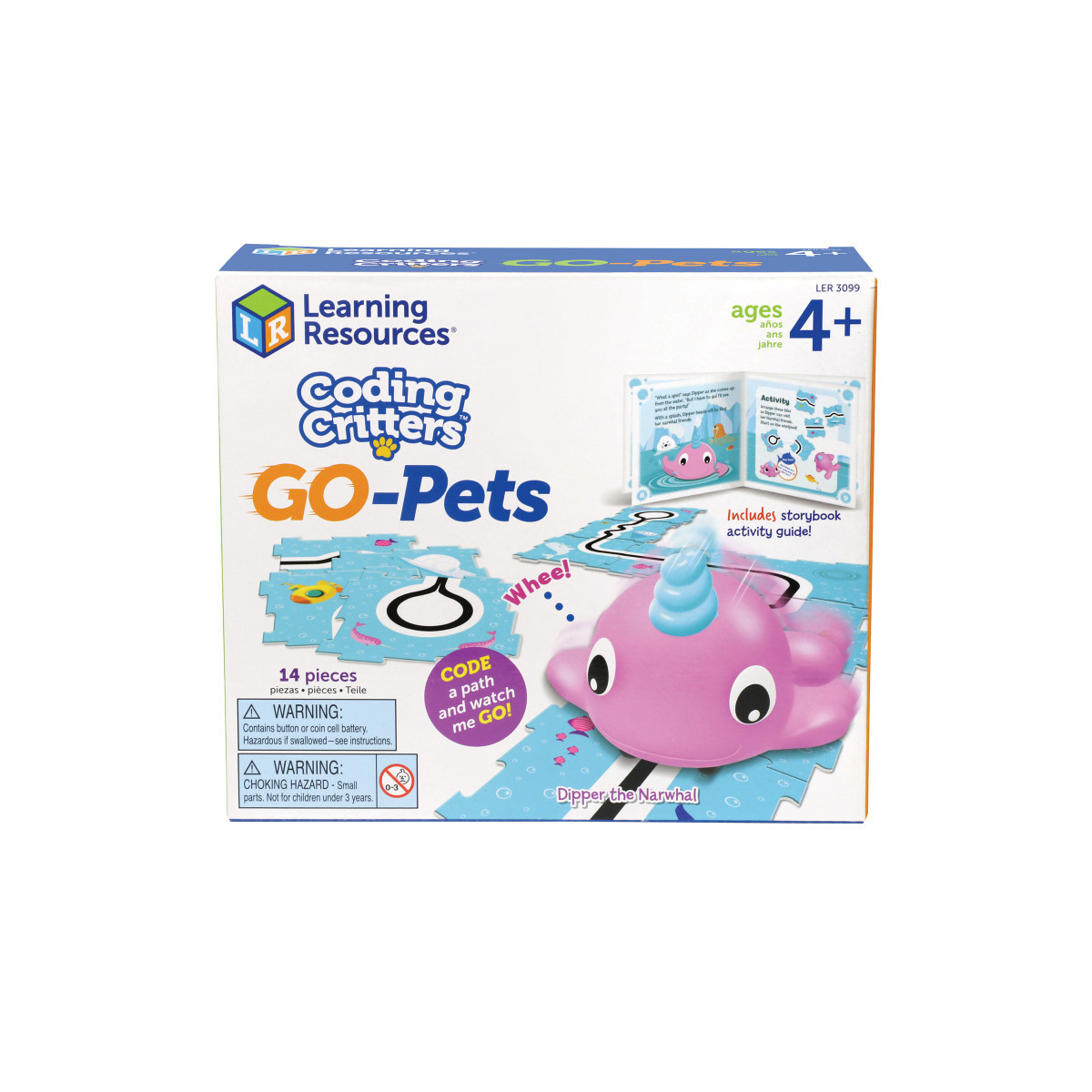 Ready, set… code! Get ready for twisting, twirling storybook coding adventures with Dipper the Narwhal, one of the Coding Critters Go-Pets from Learning Resources. This clever motorized interactive pet knows how to follow black-line paths towards all kinds of undersea adventures! Follow along with Dipper's story in the set's 12-page full-color coding activity book, then arrange the set's 16 included tiles to code your critter and reach a goal! Every adventure with Dipper helps kids master the building blocks of coding and STEM, from counting and ordinal numbers to sequential thought and computational thinking! Dipper the Narwhal is ready for imaginative open-ended play; draw your own black-line paths for her to follow, or flip over the tiles for extra black-line segments that help extend the preschool learning fun! Dipper also works with all Coding Critters Go-Pets—what kind of coding adventures can you dream up?