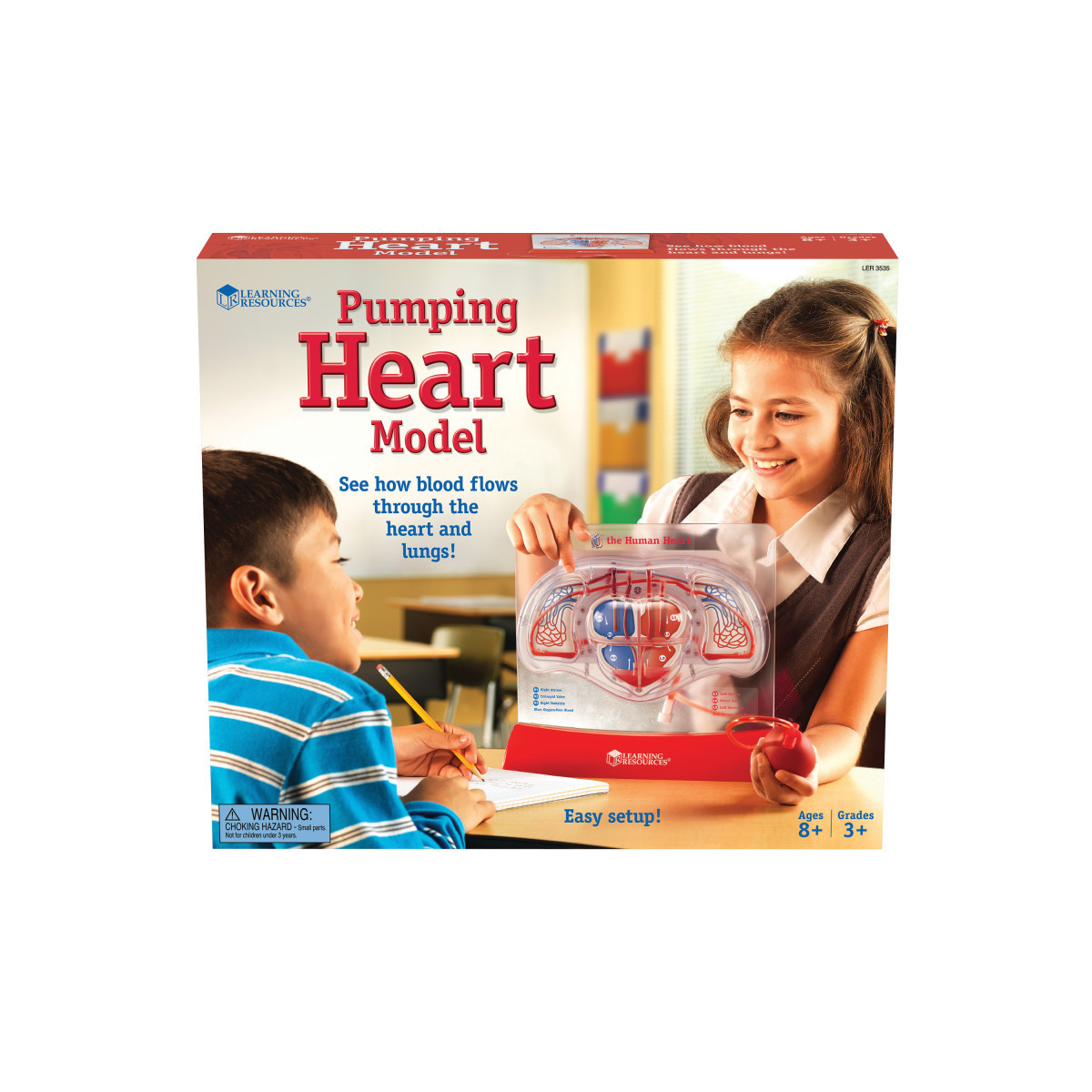 Pumping Heart ModelEasy-to-use, multi-sensory model uses a simple hand pump to demonstrate basic heart and pulmonary blood flow. Create a memorable exploration of how the heart and lungs work together for oxygen exchange. Includes clearly labeled heart chambers, main artery, veins and lungs, plus Activity Guide. Heart measures approximately 12"L x 11"W x 5"D. Grades 3+