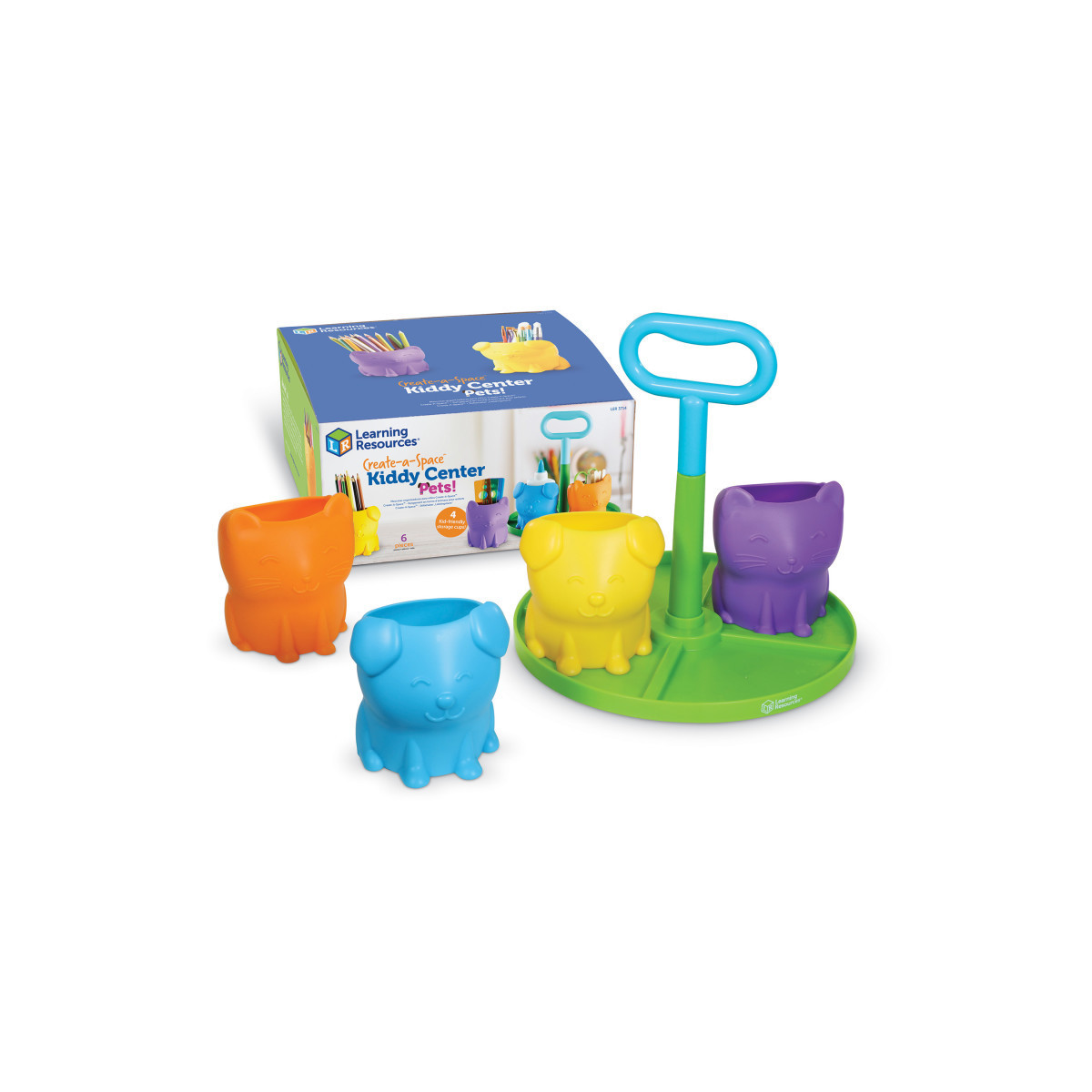 This friendly school supplies organizer makes getting organized easy and fun! Kids learn early lessons in play room organization and classroom organization every time they clean up with the fun pets of the Create-a-Space Kiddy Center from Learning Resources. A younger take on our popular Create-a-Space organizational series, this kids' art supply storage caddy adds a little bit of whimsy to storage projects with the help of colorful character cups sized just right for little hands. Each art supplies organizer comes with two dog and two cat cups, with each one ready to act as a pencil, scissor, glue stick, or crayon organizer for kids. Each pet can be used with or without the rotating base, so you can tailor your organizational plans to fit your kids' needs. If you need to take things on the go, the Create-a-Space Kiddy Center also comes with a durable easy-carry handle, whose intuitive design makes carrying this school supplies organizer from one spot to the next both simple and comfortable.