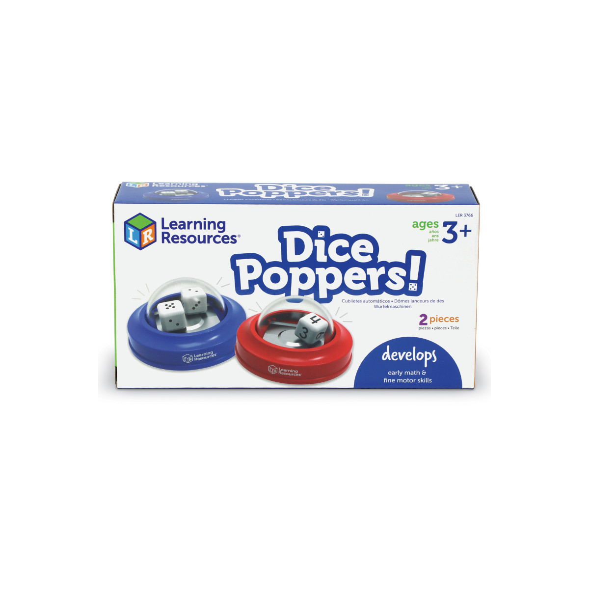The fun way to roll dice! From board games and activity sets to math workbook lessons, you'll never stop popping with Dice Poppers from Learning Resources. Built with little hands in mind, these durable plastic poppers keep dice contained and help little ones roll without frustration - the days of dice rolling off the table, under the couch, and into the unknown are over. Each set of Dice Poppers comes with two distinct poppers; the red popper features a single die numbered 1-6, while the blue popper comes with a pair of six-sided dot dice. With these versatile Dice Poppers, you can add early math fun to all kinds of activities; turn board games into educational opportunities, add a little chance to early math workbook lessons, or design your own games that build upon addition, subtraction, and more!
