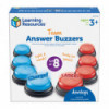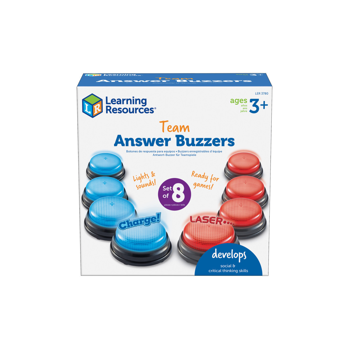 Turn everyday quizzes into fun game-show-style competitions! Buzz in and win with team games in the home or classroom with this set of Team Answer Buzzers from Learning Resources! This set comes with 8 game buzzers: 4 for the red team, and 4 for the blue team. Once you've settled on teams for classroom game shows or at-home game nights, you'll always know who's buzzing in: each team's buzzers make unique sounds that are loud, clear, and easy to tell apart! In addition to adding a fun interactive element to classroom and at-home games, this set of Team Answer Buzzers also provides great opportunities for lessons in social skills like sportsmanship, turn-taking, and teamwork. Each durable game buzzer is powered by replaceable AAA batteries (sold separately), so they're ready for years of fast-paced, hands-on games for years and years to come!