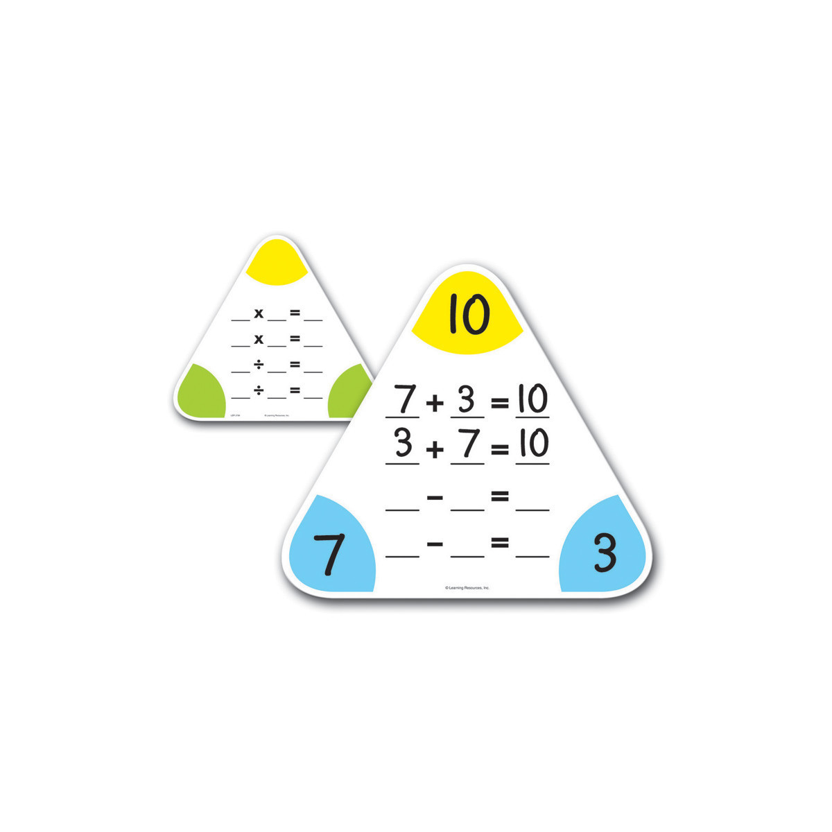 Use these math-fact triangles again and again! Familiar triangle format offers a powerful method for building number fact fluency and teaching fact families. Focuses on both addition/subtraction (on front side) and multiplication/division (on reverse). Supports development of higher-level algebraic skills such as equation building, the commutative property and problem solving. Write & wipe surface on both sides of the board. Triangle boards measure 10"H. Grades 1+. Each set includes 5 boards.