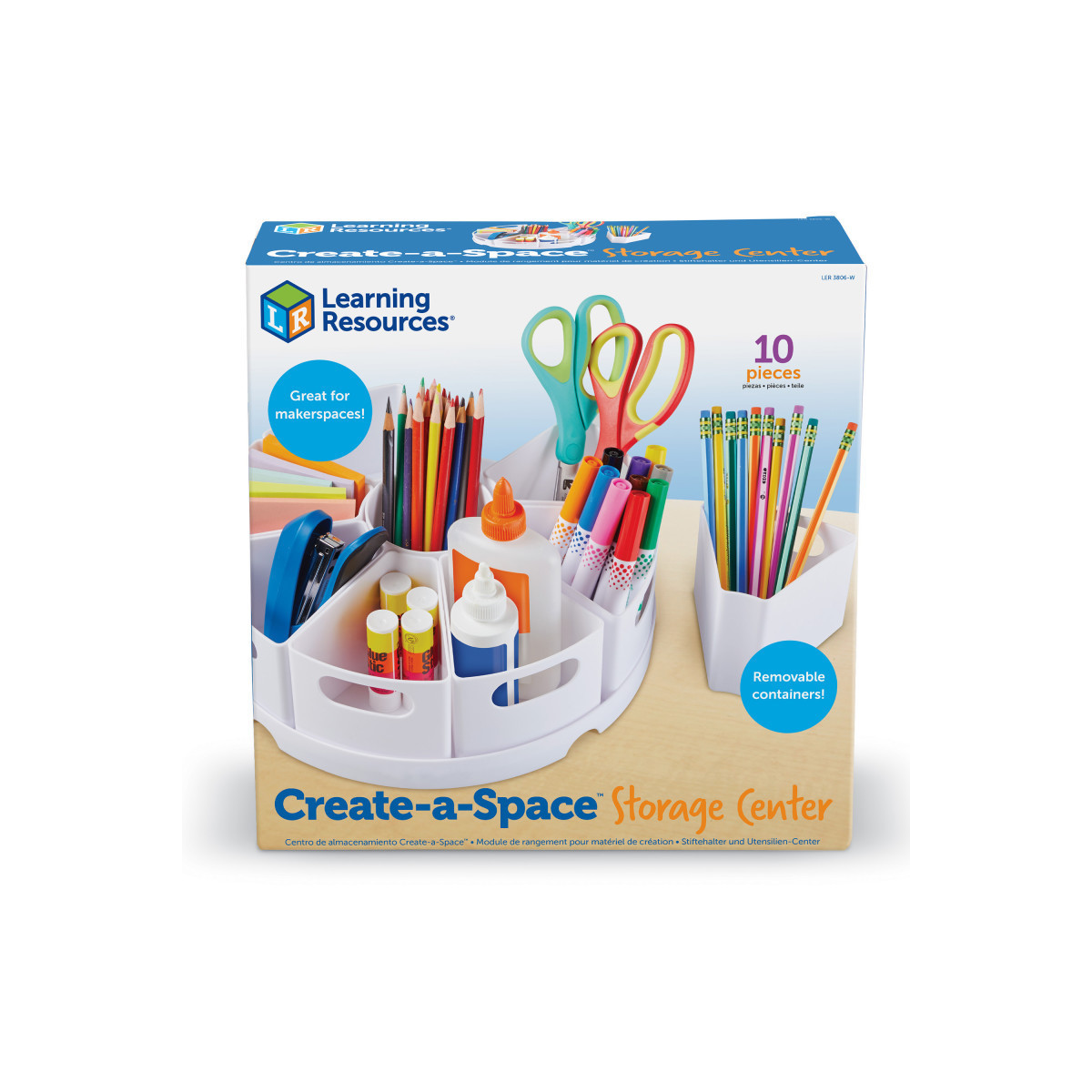Make a meeting place for creative minds with our popular organizer—now in white! The Create-a-Space Storage Center brings an easy, convenient way to organize and present everyday “maker” materials in the classroom. Includes a 12” circular tray with 8 durable containers.