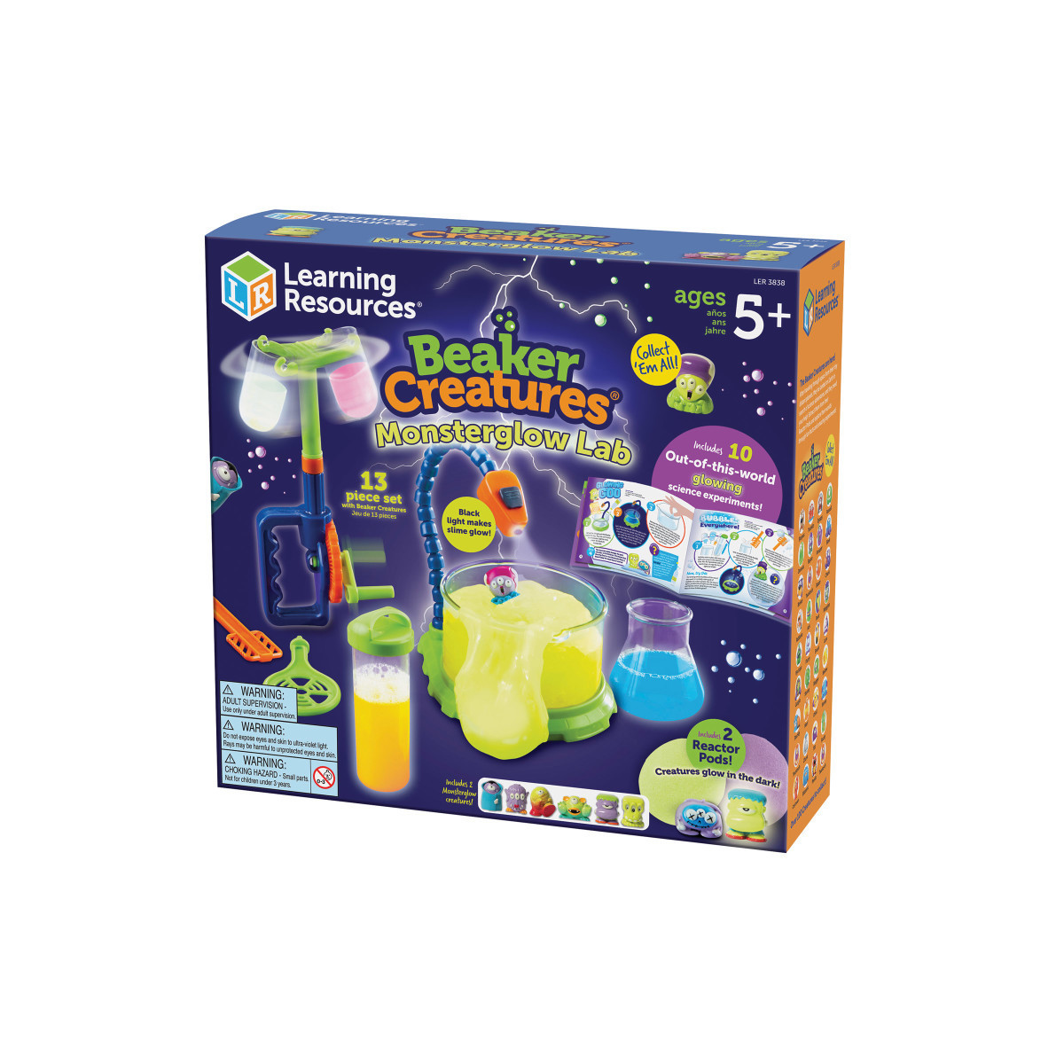 Are you ready to make new glowing, ghoulish science discoveries? Uncover the secrets and science behind the glow with the Beaker Creatures Monsterglow Lab from Learning Resources. This real working kids' experiment lab set helps your little creatures scientists build fun STEM skills with experiments inspired by biology, chemistry, and astronomy! Explore the 20-page full-color experiment booklet to learn facts about bioluminescence, make your own glowing slime and cobwebs, and more! There are more than 20 spooky experiments to master! The Beaker Creatures Monsterglow Lab includes exclusive creature lab components - spin up your glowing creations with the twisting, twirling centrifuge, or activate your black light blaster to trigger a glowing reaction. The Beaker Creatures Monsterglow Lab also comes with two Beaker Creatures Reactor Pods featuring collectible glow-in-the-dark Monsterglow creatures to add to your Beaker Creatures collection!