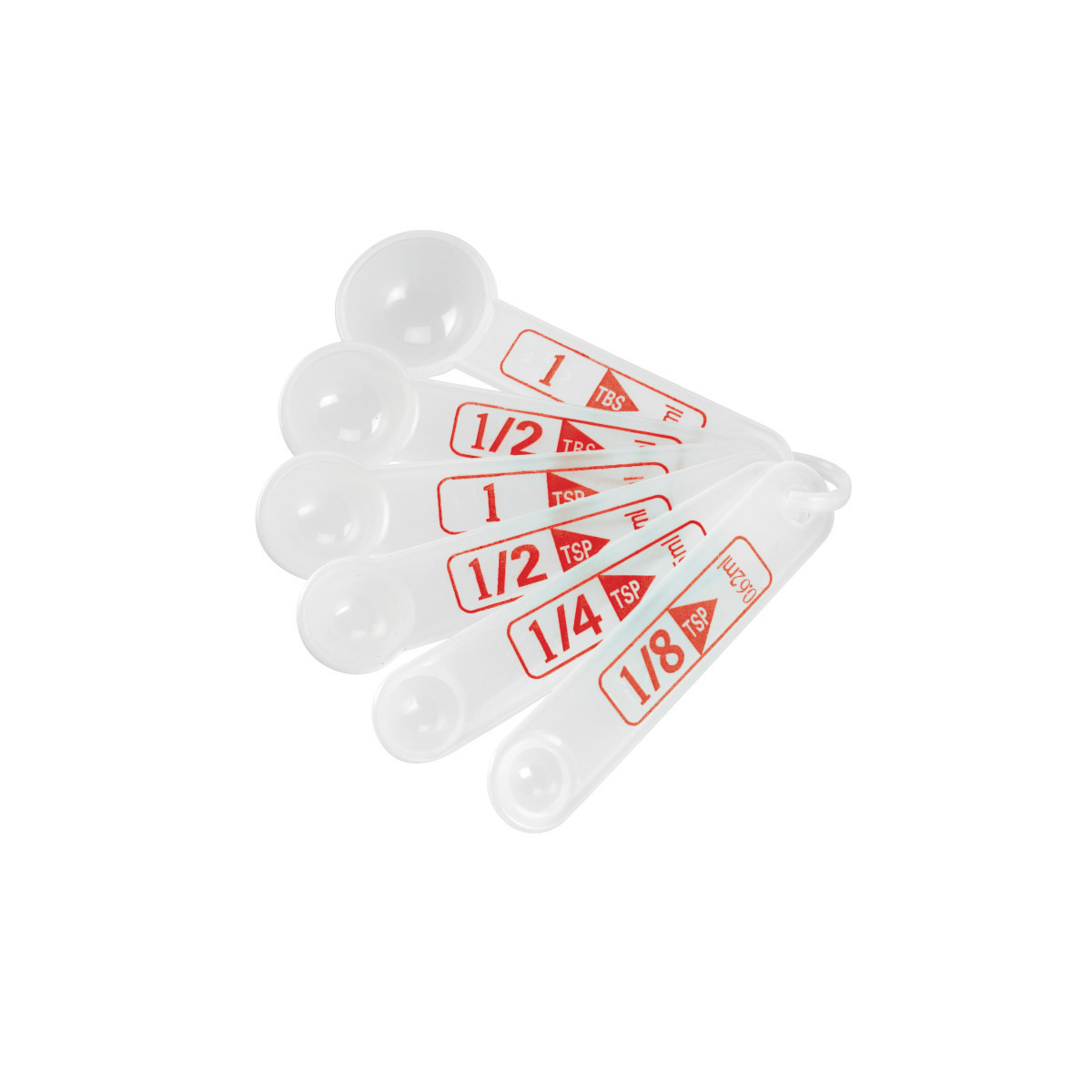 Set of 5 sturdy plastic measures comes with detachable rings and nests for storage. Includes 1/8 teaspoon (0.62 ml), ¼teaspoon (1.25 ml), ½ teaspoon (2.5 ml), 1 teaspoon (5 ml), ½ tablespoon (7.5 ml), and 1 tablespoon (15 ml). Sold as a pack of 12 measuring spoon sets.