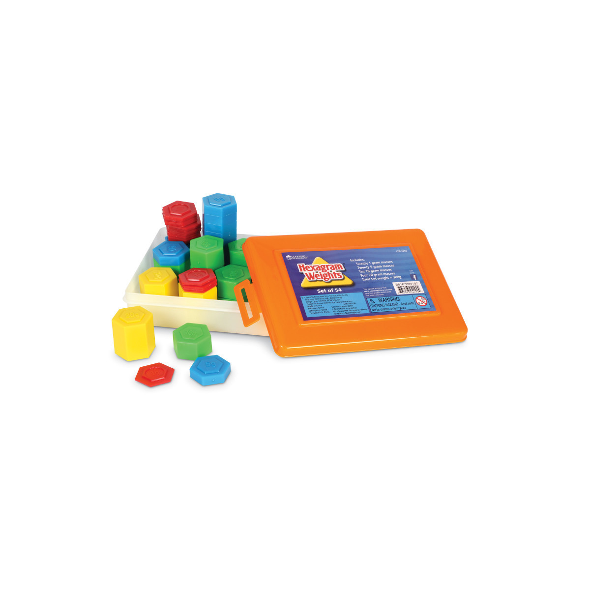 Explore weight and measurement with these easily stackable Hexagram® Weights. Color-coded weights offer visual cues in measurement activities. Set of 54 includes twenty 1g, twenty 5g, ten 10g and four 20g weights.
