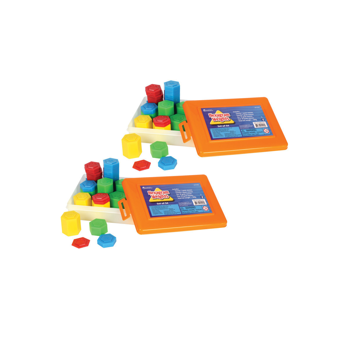 Explore weight and measurement with these easily stackable Hexagram® Weights. Color-coded weights offer visual cues in measurement activities. Each set of 54 includes twenty 1g, twenty 5g, ten 10g and four 20g weights. Sold as 2 sets for a total of 108 pieces.