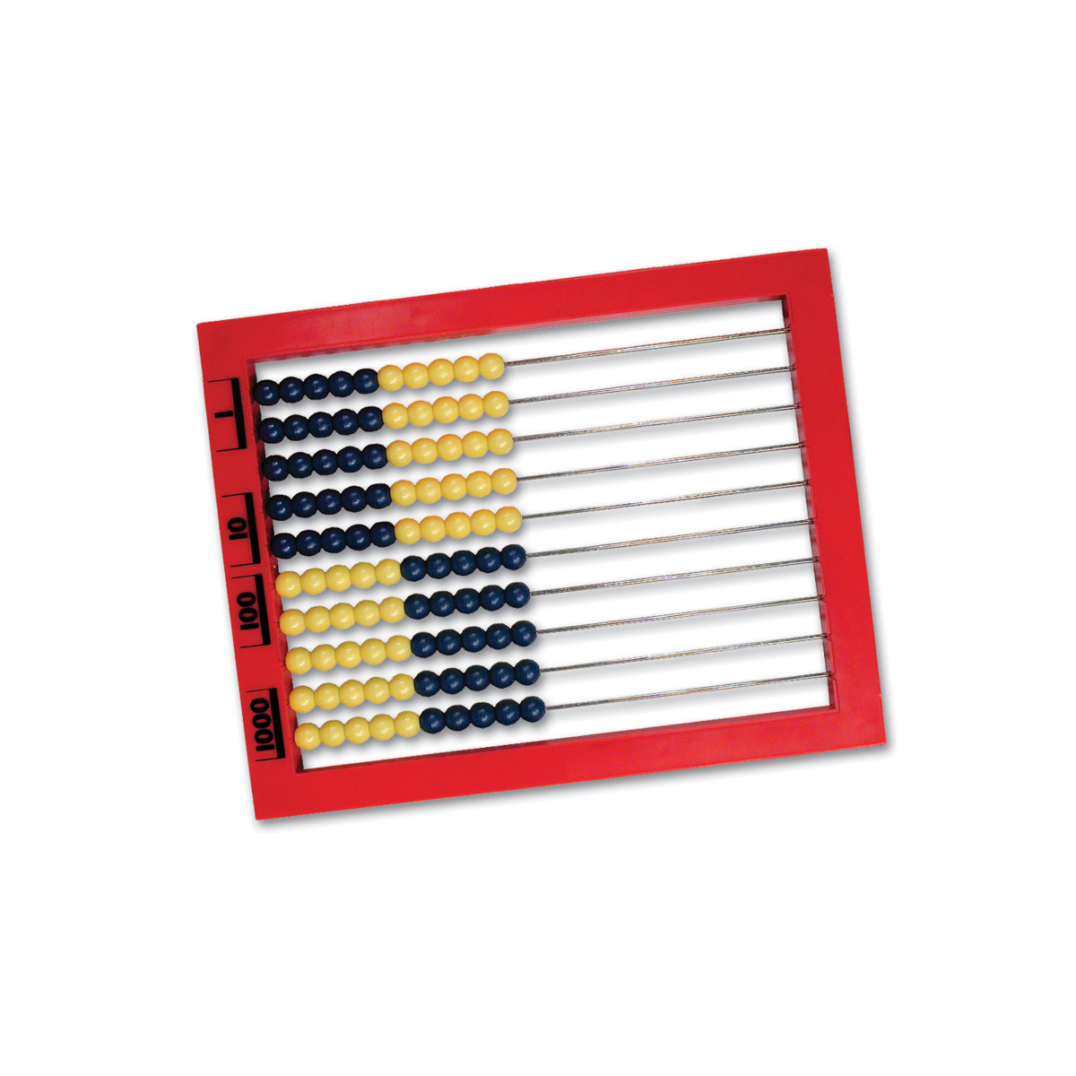 This abacus features a frame that is thicker than the beads, which allows abacus to lie flat on student desks. Abacus activities offer students tactile counting practice and visual reinforcement of math facts. Includes 10 rows of 10 beads in 2 colors grouped in fives for ease of use. Abacus measures 8 1/2" L x 9 1/2" W x 1/2" H.
