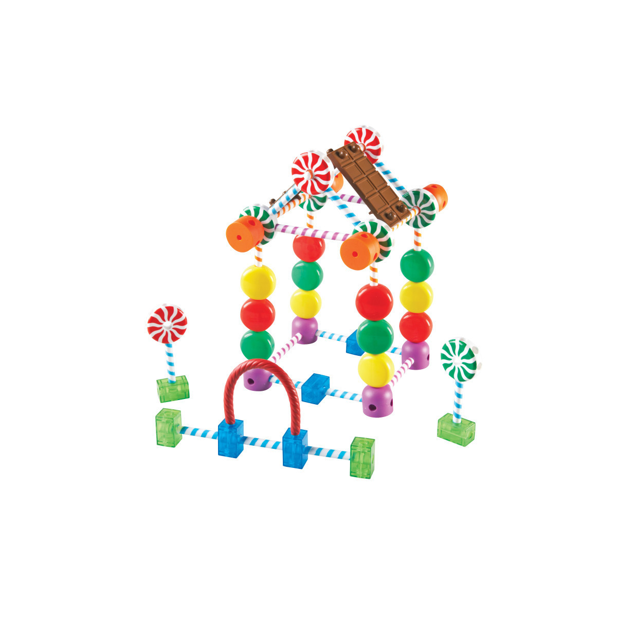 Candy Construction™ Little engineers build sweet structures, fine motor strength and foundational STEM skills! Includes chunky, durable candy pieces in a variety of fun, familiar designs plus Activity Guide with illustrated, step-by-step building directions. Largest piece measures 7"L x .5" in diameter. Grades PreK+. Set of 92. Includes: 32 Small, medium and large swirl sticks, 8 Green swirl connectors, 8 Red swirl connectors, 8 Gumdrop pieces, 12 Colored disks, 8 Green connectors, 8 Blue connectors, 4 Bendy twists, 4 Chocolate panels.