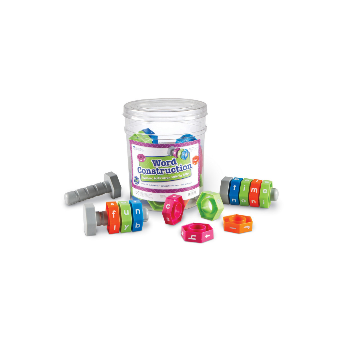 A nuts-and-bolts approach to making, and spelling, words! Start with consonant, vowel, consonant to make a word. Then, turn any piece to make a new word. Kids can progress to making longer words, with each bolt holding up to 4 nuts. Includes 6 bolts, 30 printed nuts (enough for multiple kids), and Activity Guide. Bolts measure 5"L, nuts 2.5"L. Grades: K+.