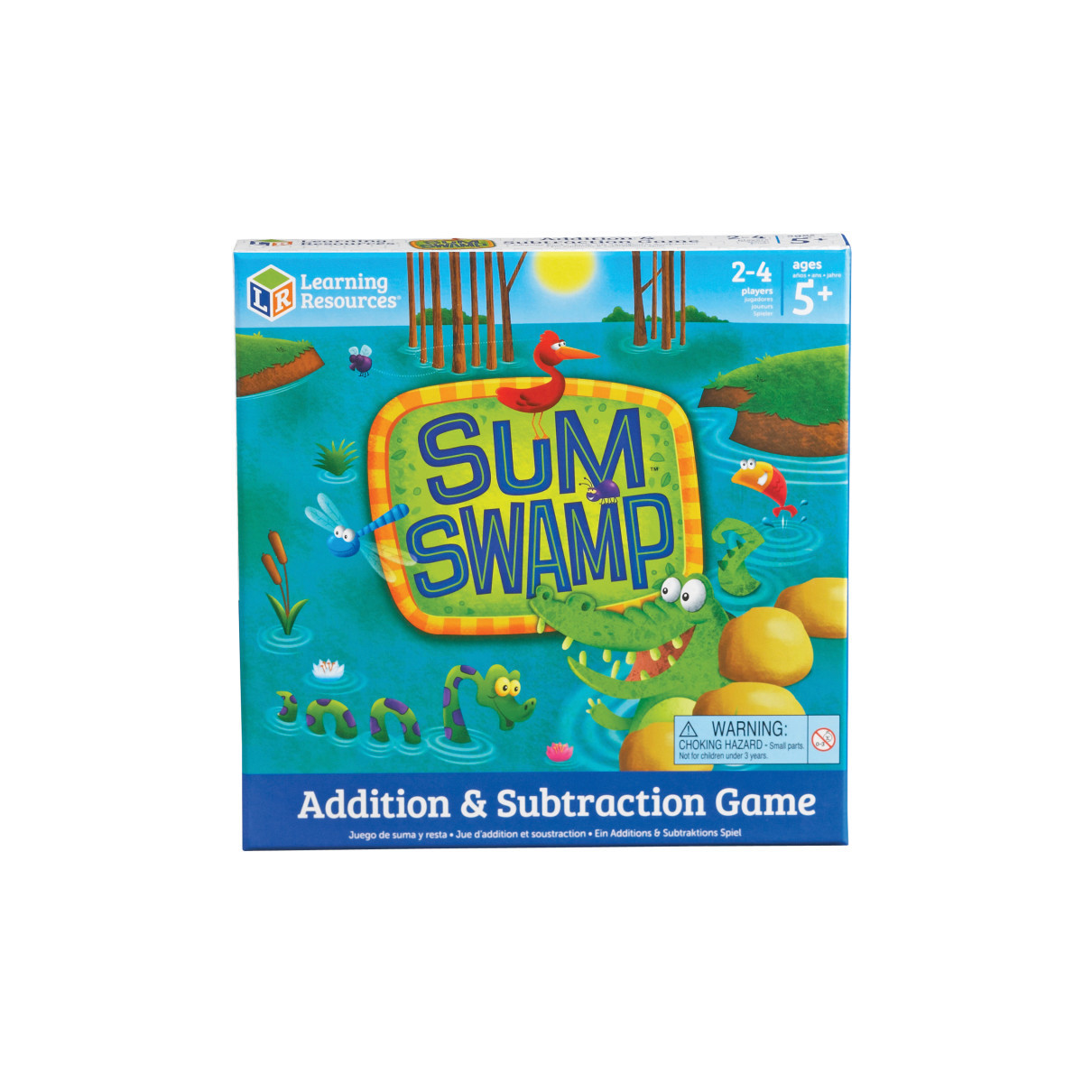 Math becomes an adventure with this award-winning addition and subtraction game that takes kids on a journey through Sum Swamp. They'll make their way over the crocodile shortcut and through the swamp to the finish by adding and subtracting the numbers on the dice. Engage students as they explore and apply the properties of operations. Our unique tools reinforce these essential skills while challenging students to create and mentally solve equations. Fun way to practice simple operations! Includes game board, 4 swamp creature game pieces, 2 number dice, and an operations die. Board measures 17" L x 12" H. For 2-4 players. Grades K+ Ages 5+.