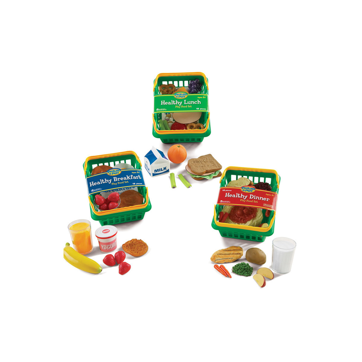BREAKFAST, LUNCH & DINNER PLAY FOOD: Includes Healthy Breakfast, Healthy Lunch, and Healthy Dinner baskets - each containing a variety of nutritious life-size foods