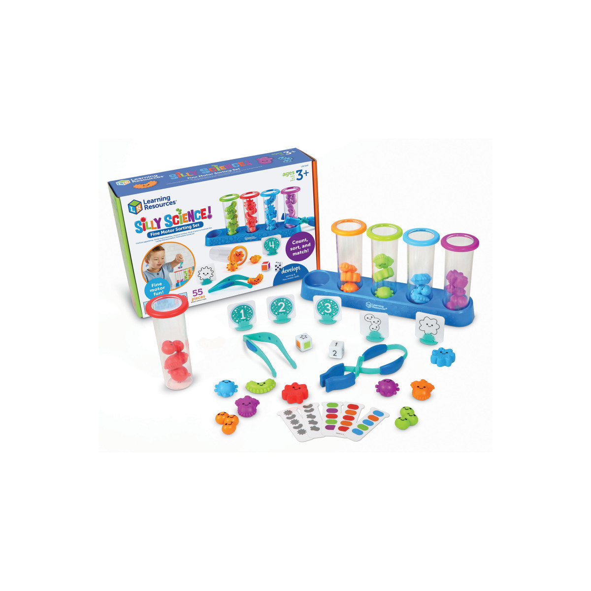These germs are ready to help kids build preschool fine motor skills! Kids build school-ready skills as they count, sort, and match the colorful germs found in the Silly Science! Fine Motor Sorting Set, an educational toy for 3 year olds from Learning Resources. Made in five fun shapes and five vibrant colors, these germ-themed preK manipulatives help kids strengthen their color, shape, and number skills through fun science-themed sorting activities. Each sorting adventure in this STEM toy for kids also introduces essential preschool fine motor skills with the help of two specialized fine motor tools—squeeze the clamp to lift the test tube and strengthen hand muscles, or pinch the tweezers to pick up germs and work on precision skills! The Silly Science Fine Motor Sorting Set's included activity guide also turns the skill-building fun into a game with multiple toddler activities—use the set's 10 game cards to build color sequences, or roll the dice and solve your own counting and sorting challenges! Made from durable wipe-clean plastic, these STEM toys for kids are also great for introducing little ones to early lab tools and vocabulary!