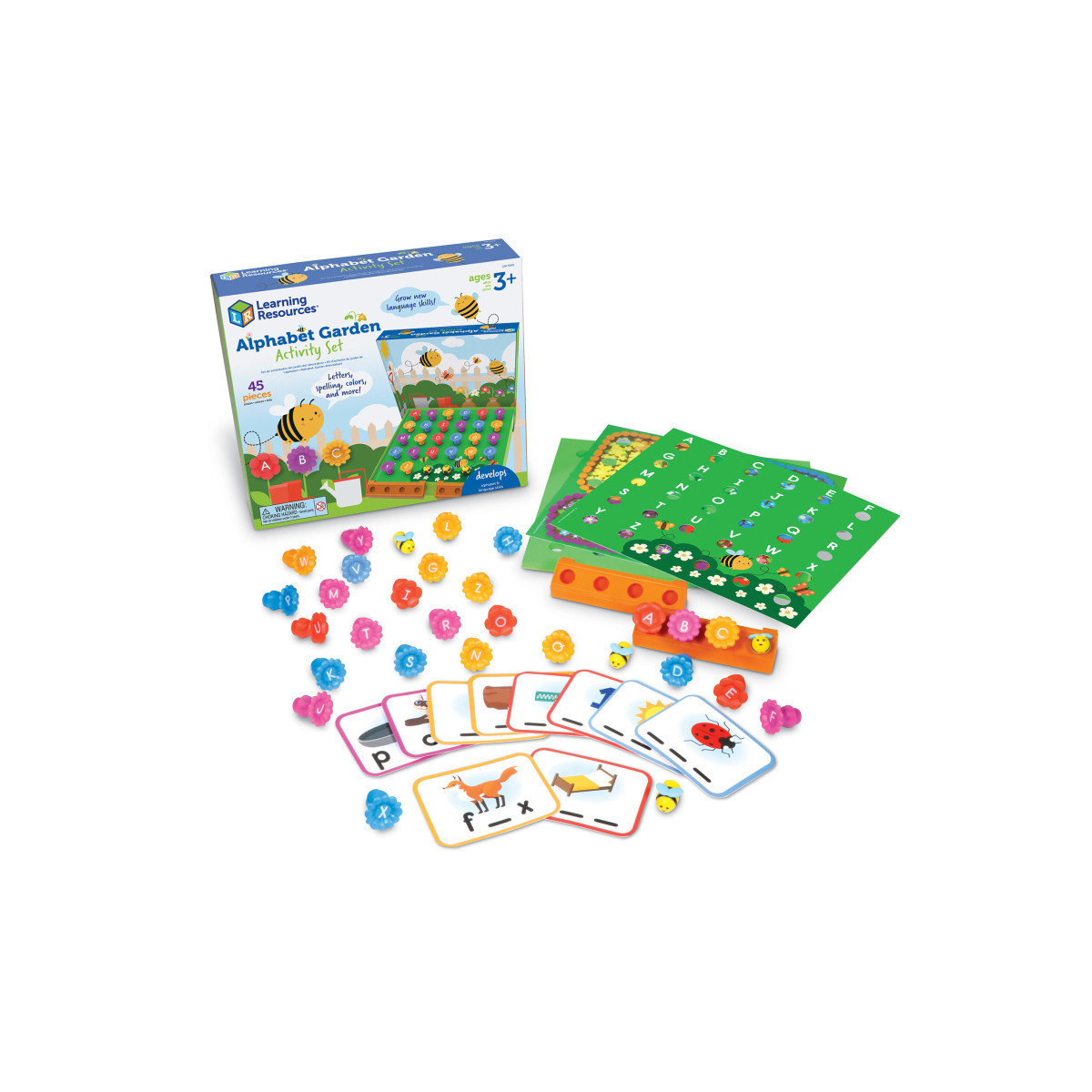 In this garden, we grow new preschool alphabet skills! Kids match uppercase and lowercase letters, spell simple words, and more whenever they visit the Alphabet Garden Activity set from Learning Resources! Sized for little hands, each friendly preschool alphabet flower is ready for one of this toddler brain toy's 15+ activities that help kids build school-ready skills—identify the missing letter, spell simple vocabulary words, match colors with the corresponding flowerbed, and more! Joined by four friendly bee counters, each of the set's colorful alphabet also helps kids build fine motor skills every time the go on toddler preschool learning adventures. Each of this set's fun activities takes place in the all-in-one playset environment, which features two unique double-sided playmats and engaging illustrations that boost imaginative skills along the way. The Alphabet Garden Activity Set's all-in-one playset also means built-in storage—when playtime is done for the day, simply gather the pieces into the reusable storage box until it's time for more toddler preschool learning fun! The Alphabet Garden Activity Set makes a great addition to collections of educational indoor games and preschool activity sets for homes and classrooms!