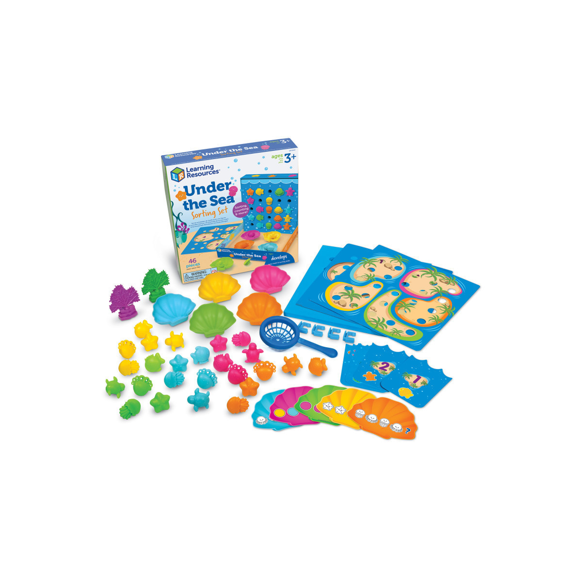 This educational toy set is an undersea sorting extravaganza! Kids sort, match, count, and more during toddler activities filled with colorful sea creatures every time they play with the Under the Sea Sorting Set from Learning Resources! Sized for little hands, each friendly sea creature in this educational toy for 3 year olds is ready for one of this set's 13 activities that help kids build school-ready skills—count from 1-25, sort by shape, use them as a color teaching toy, and more! Shaped like sea turtles, jellyfish, starfish, and more, each of the colorful counters also helps kids build fine motor skills every time the sort, match, and count. Each of this set's fun toddler activities takes place in the all-in-one playset environment, which features two unique double-sided playmats and engaging illustrations that boost imaginative skills along the way.