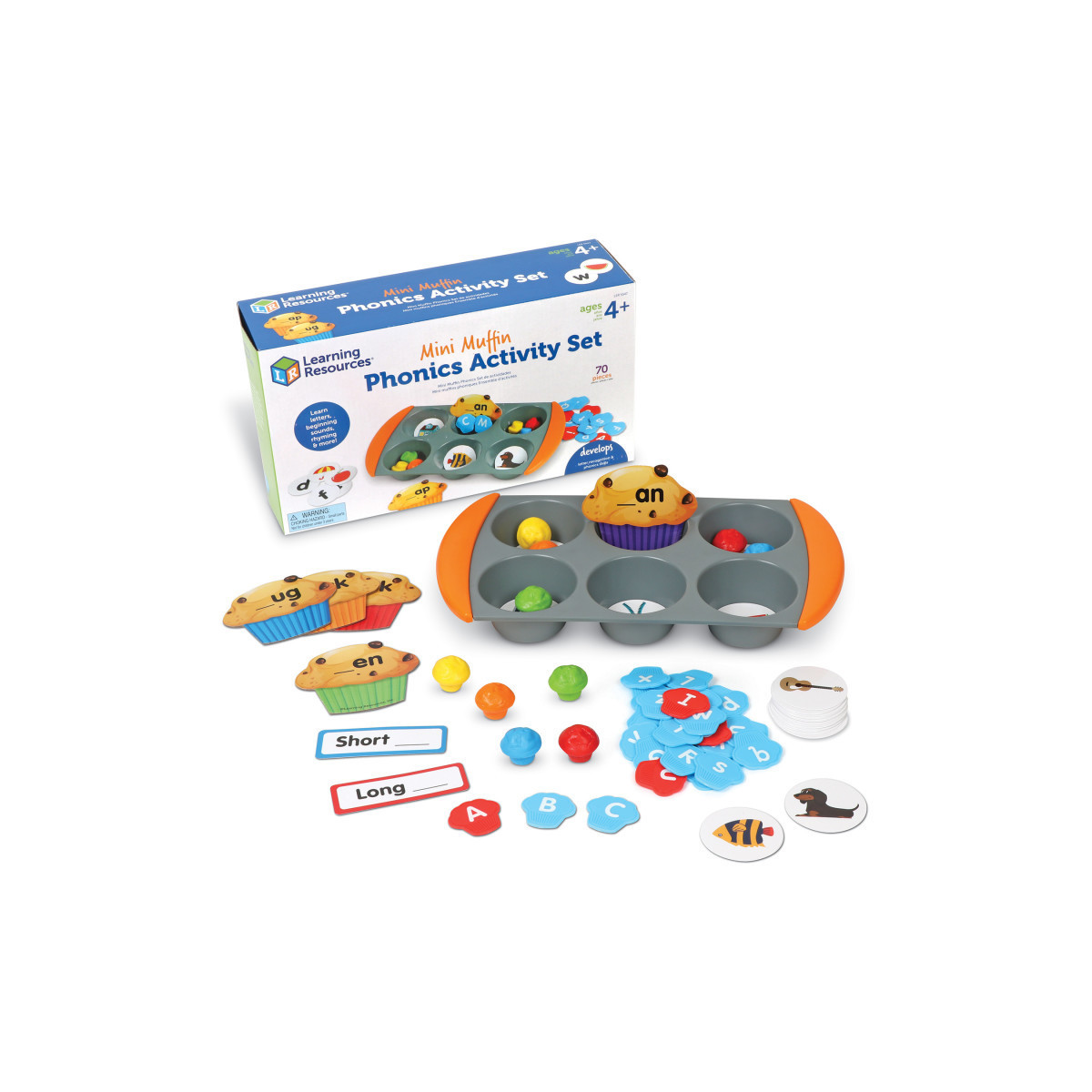 Bake up a fresh batch of phonics skills! There's big-time letter learning to be found in the mini muffins of the Mini Muffin Phonics Activity Set, one of the preschool learning toys from Learning Resources. This comprehensive phonics activity set and educational toy introduces kids to all kinds of school-ready English language arts skills—there's letter identification, beginning sounds, syllables, rhyming, and other essential phonics skills. Best of all, the preschool learning activities in the Mini Muffin Phonics Activity Set grow with your kids' skills—start with uppercase and lowercase letter recognition, then move on to word families, early vocabulary, and more as this becomes a kindergarten toy!