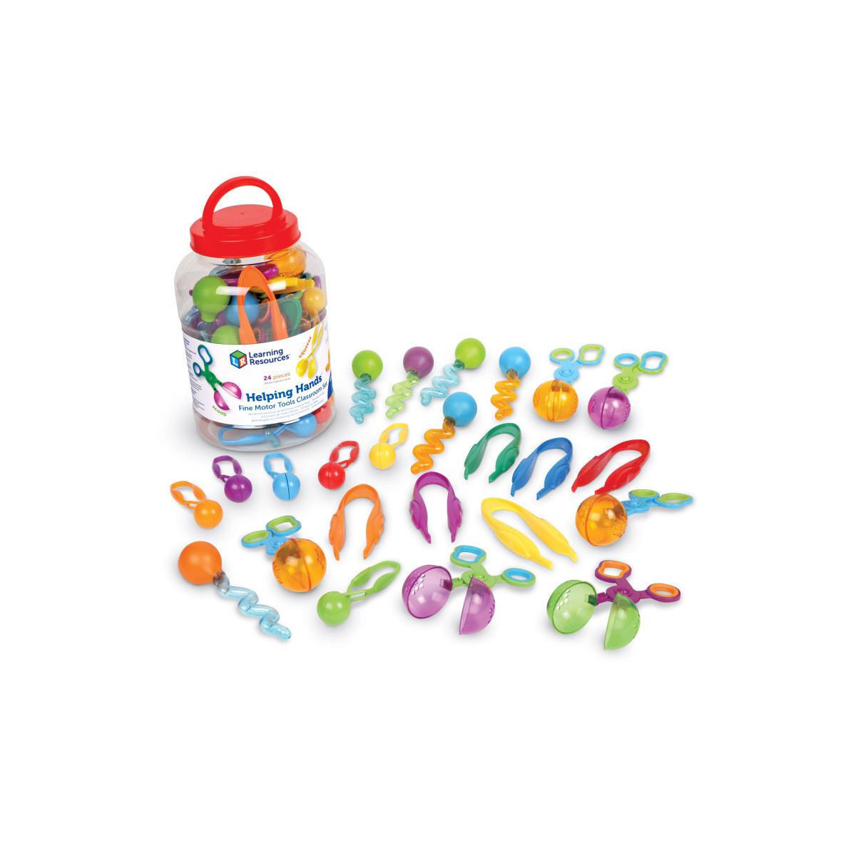 Kids twist, scoop, squeeze, and build little hand muscles with four types of fine motor tools. Set of 24 includes 6 each of the following: Jumbo Tweezers, Handy Scoopers™, Twisty Droppers™, and Squeezy Tweezers™. Reusable bucket doubles as easy storage. Largest tool measures 6"L.