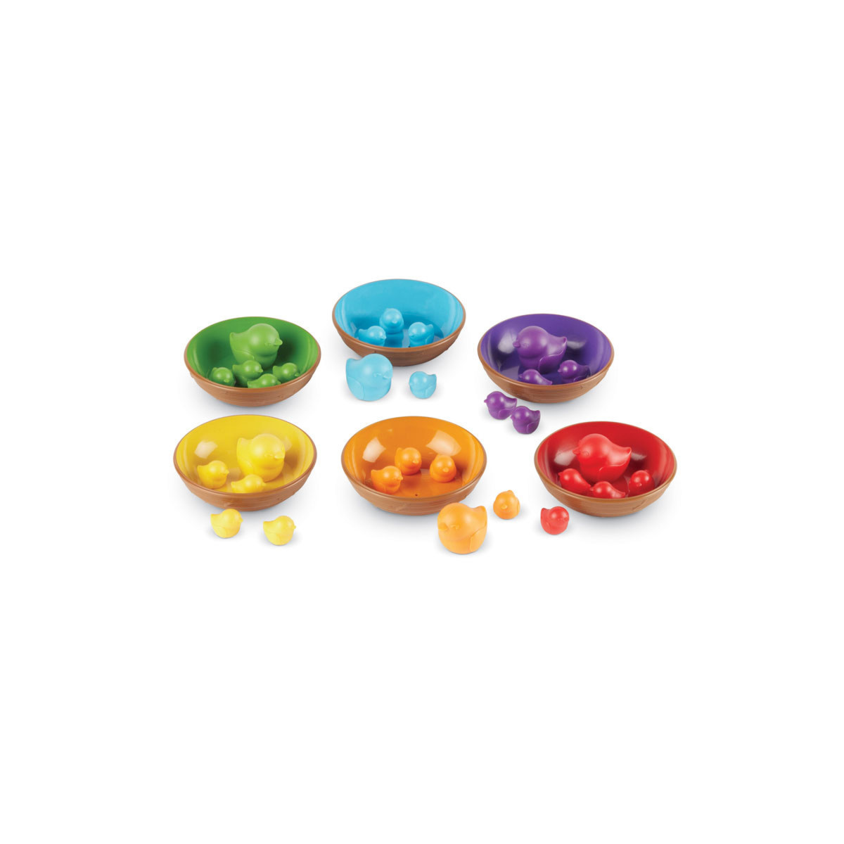 Add an imaginative touch to learning play with this momma and baby bird nesting theme. Perfect for teaching sorting, counting, and colors. Bowls stack for easy storage. Set of 36 includes 24 baby birds in 6 colors, 6 momma birds, 6 color nests, and Activity Guide. Nests measure 4"L x 1"H; birds measure 1"H (baby) and 1.75"H (momma).