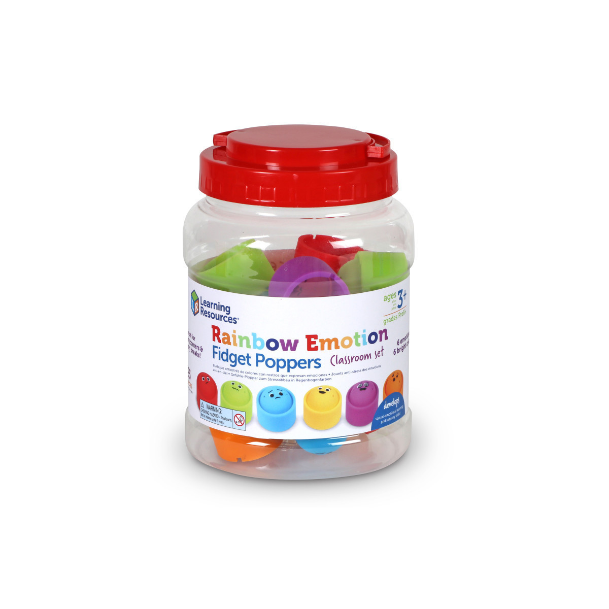 These fun fidget poppers help you feel your feelings while you fidget! Kids build social-emotional learning and sensory skills every time they fidget with the Rainbow Emotion Fidget Poppers from Learning Resources. Made from soft BPA-free silicone and sized for little hands, these colorful fidget poppers come with an added surprise—each one sports one of five emoji-style faces that help kids identify and talk about their feelings. The fidget poppers also stack for added fine motor fidget fun! Whether they're learning about colors, building new social-emotional learning skills, or simply enjoying some fidget time, kids will find plenty to do with these versatile fidget poppers. With four sets of poppers in 6 color and emotions, the Rainbow Emotion Fidget Poppers Classroom Set is ready for years of social-emotional learning fun during classroom instruction, as part of calm down corners or school counselor supplies, or even as a therapy game for kids!
